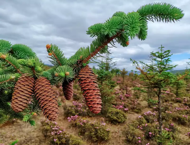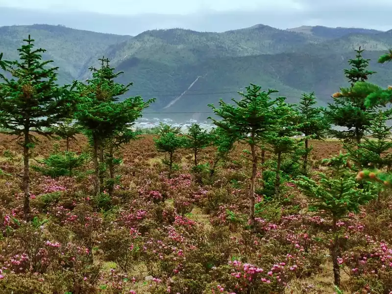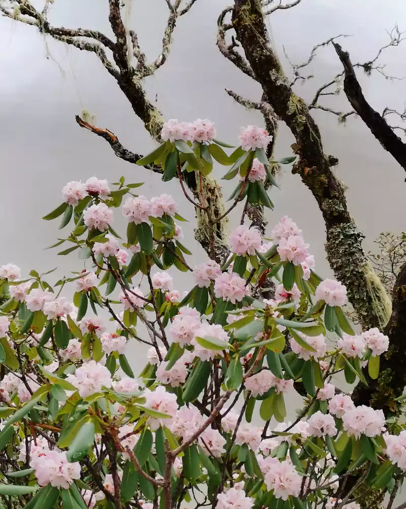 森林的周边和树之间一片一片的杜鹃花开得正旺,远远看去灰蒙蒙的一片,但近处观赏却很是鲜艳、动人。