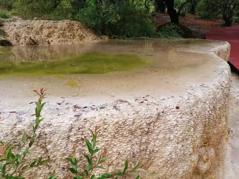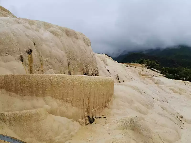 栈道坡度较大,走起来还是有点费力气,不过两千多的海拔不会有高反,我们的时间也很充分,所以慢悠悠的上行也并不太费力。大约上行了十来分钟的时间,看到一处水台,本以为到了呢,结果一看居然一处人造的水台。有点不太理解啊,为啥上面是正经的自然白水台,为何在下面修一处人工白水台。