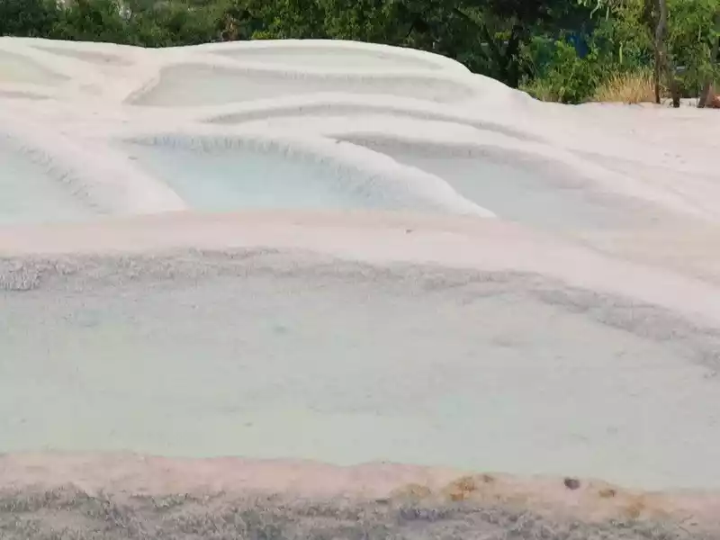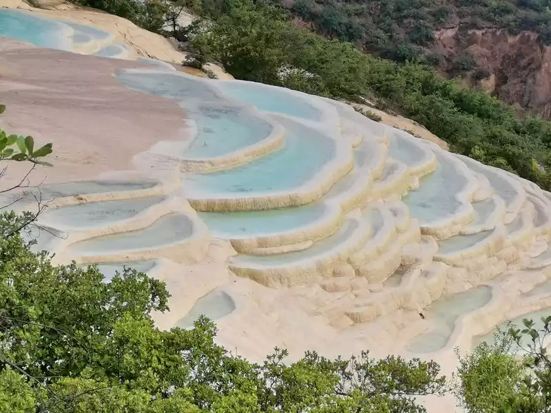 由观景台向白水台望去,白水台景区的最大一片水台------“仙人遗田”尽揽眼底,蓝莹莹的水面、玉石般的水台被四周绿色的山峦拥抱着,着实十分的灵动。