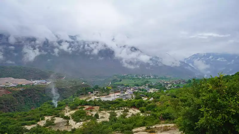 由观景台向山下看去,是被群山包围着的三坝乡白地村,虽然远山几乎被云雾笼罩,但位于群山脚下的村子却十分清晰。