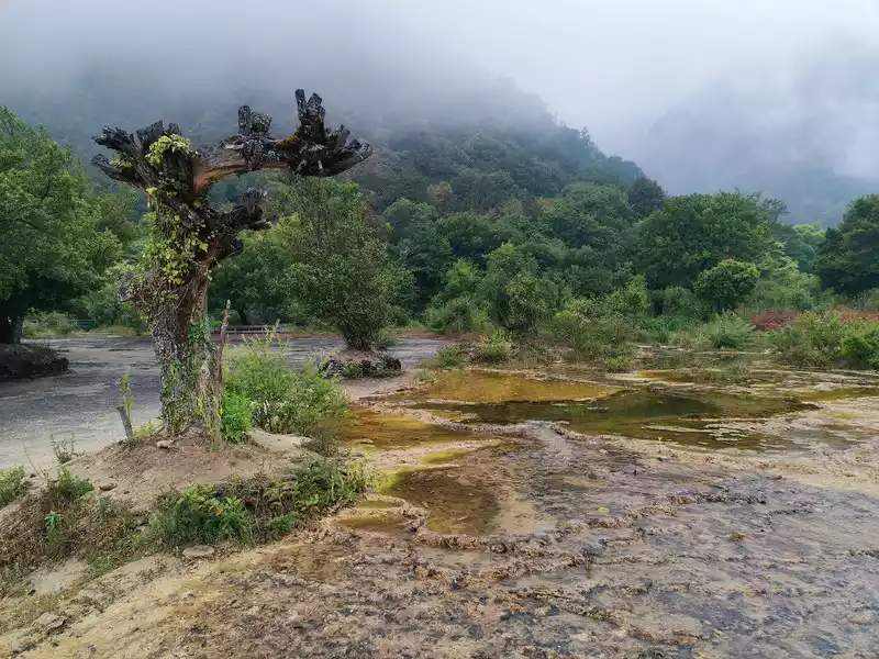 走在栈道上向水台的另一边望去,山脉仍旧烟雨朦胧,而一棵几乎枯了的老树昂首挺立的姿态很是感人。