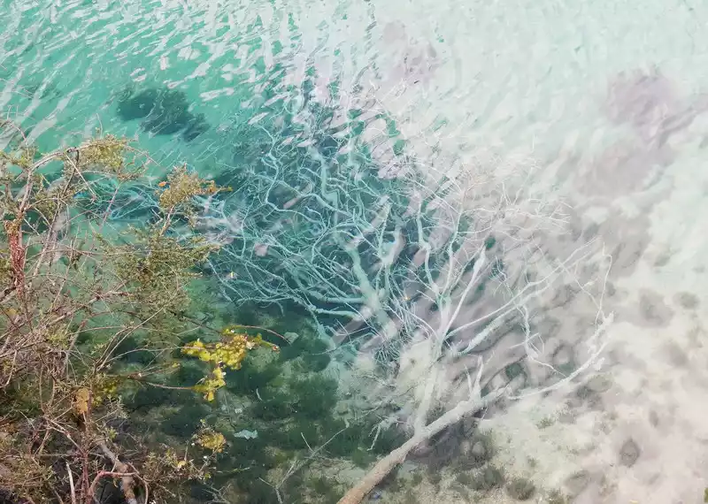 The lake where the plank road starts is as clear as a turquoise, and the roots and branches of the trees under the water are clearly visible.
