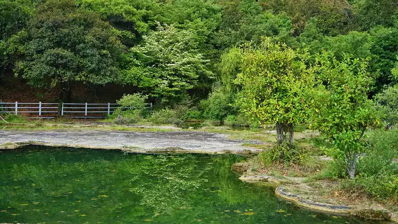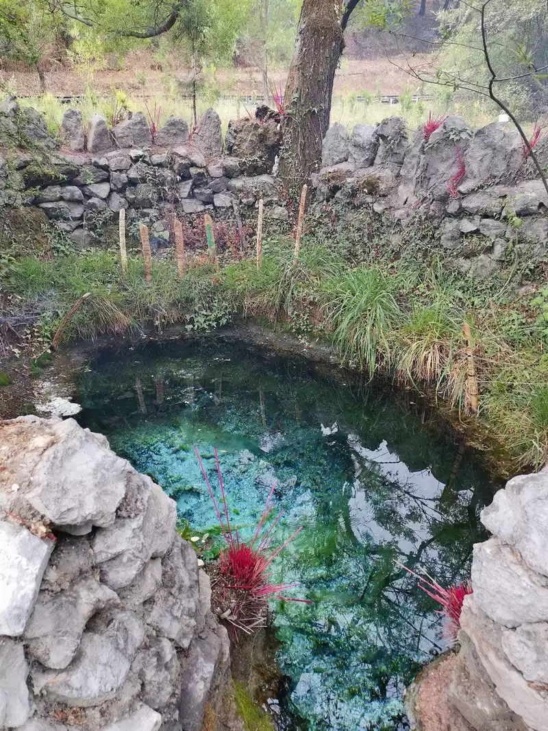泉水面积不大,但看上去很深。泉水的周壁就是泥土、石块,但泉水色深却非常清洌,如同一棵宝石。