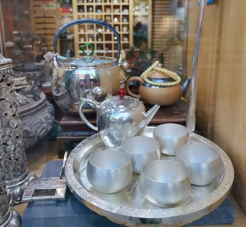 店铺橱窗里的银器在木制摆台的映衬下更显耀目。
