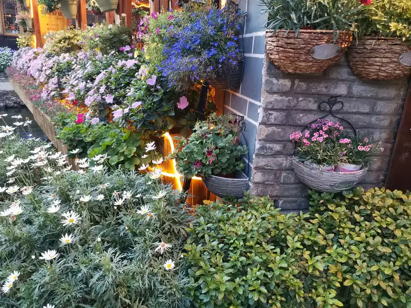灯饰将街道特别是店铺外的花墙装扮的格外漂亮。