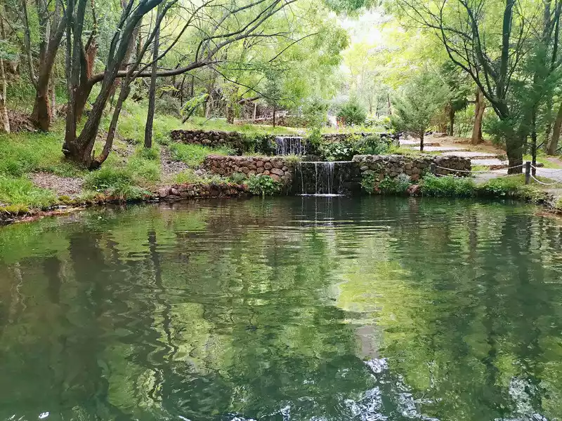 Walking along the stone plank road across the lake below the artificial waterfall to the opposite side and around the lake, we can enjoy another wonderful perspective.