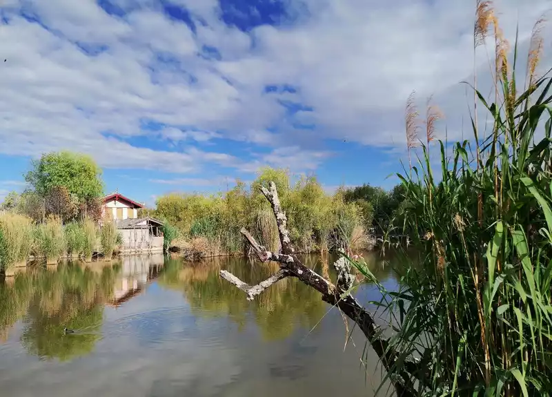 Walking along the boardwalk on the lake, you can see dense reeds separating the blue lake.