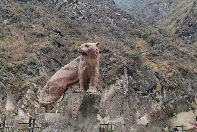 The iconic tiger sculpture at the viewing platform at the bottom of Tiger Leaping Gorge in Shangri-La is also a popular check-in spot for tourists.