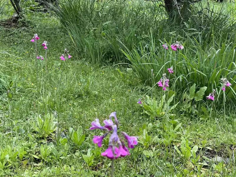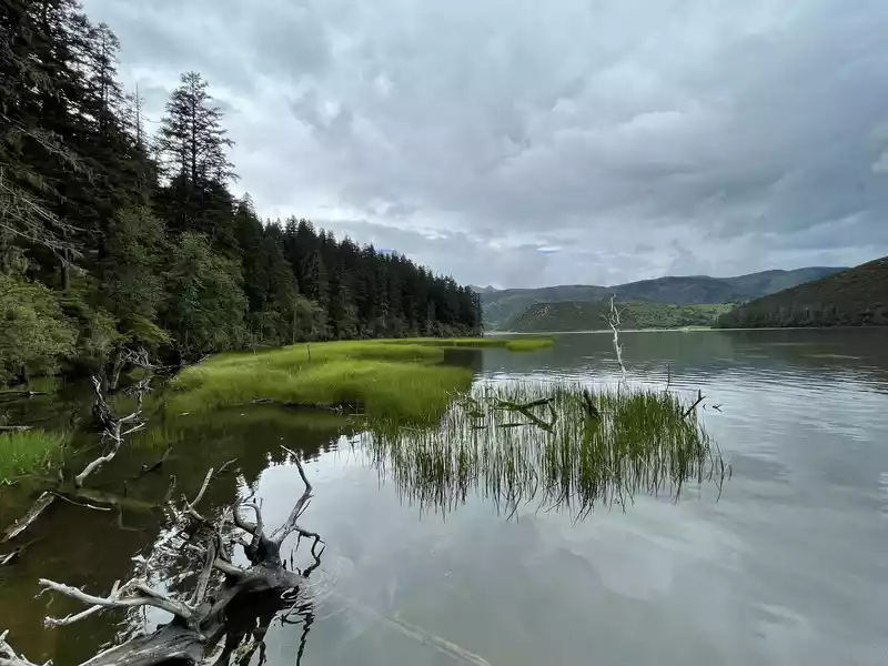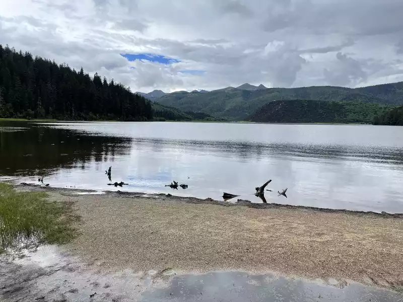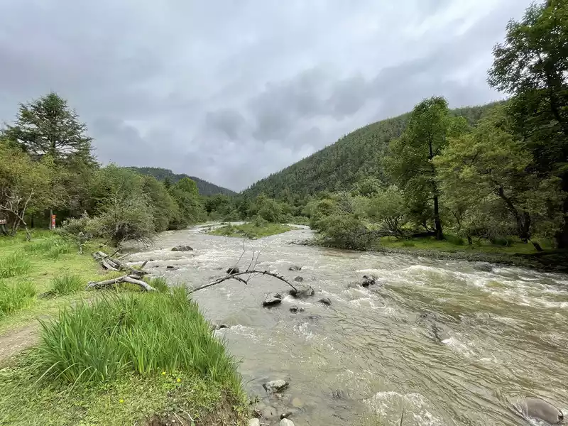 After visiting Songzanlin Temple, we returned to Dukezong Ancient Town for dinner in the evening. We chose Yizun Hotpot Restaurant near the ancient city. Their yak noodles and ox trotters were excellent. We also ordered some fresh yak beef and vegetables for a hearty dinner. Afterward, we headed back to the hotel to rest. The next morning, we headed to Pudacuo National Park. We enjoyed a hearty buffet breakfast at the hotel and then drove off. Pudacuo National Park is over 20 kilometers from the city center, about a 40-minute drive. The first few kilometers out of town are on excellent asphalt roads, offering beautiful views of the plains. The rest of the road to the park is currently being widened and is entirely dirt. Rainwater and potholes make the road a bit bumpy. Repairs are expected to take a year. However, due to the wide road and short distance, we arrived at the scenic spot relatively early. The scenic area has a large free parking lot, making parking very convenient. After getting off the bus, we went directly to the ticket office to purchase tickets, then boarded the scenic bus into the area. Currently, only the Shudu Lake area is open to the public, which can be divided into two sections: the first section is about 2 kilometers long, with a stream, trees, and wetlands, and the second section is about 3 kilometers long, along the lakeside boardwalk. We took the sightseeing bus from the scenic area entrance and disembarked after about 10 minutes. We followed the stream upstream through the trees, admiring the stream, flowers, and other sights. We reached the waterfall, then boarded the sightseeing bus again to Shudu Lake, where we could walk along the lakeside boardwalk. Our visit was rainy and cloudy, with the temperature around 15 degrees Celsius, a very comfortable 50 degrees Celsius. The lush green mountains, wetlands, and meadows, all took in the panoramic views. We walked and took photos, and the tour lasted over four hours. It was already past 1:00 PM when we returned to the scenic area entrance, and we had cross-bridge rice noodles at the exit. Since it's within the scenic area, the price was a bit high, so the value wasn't great.