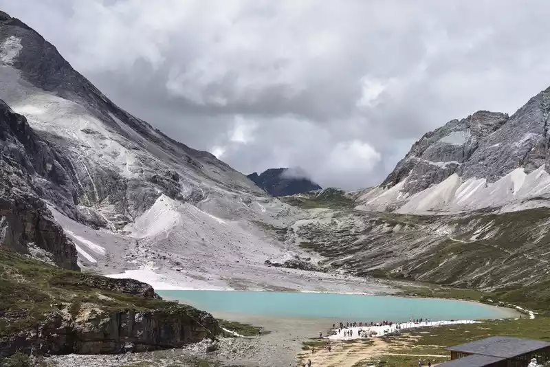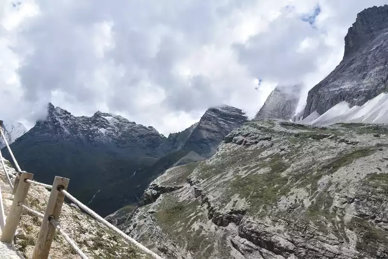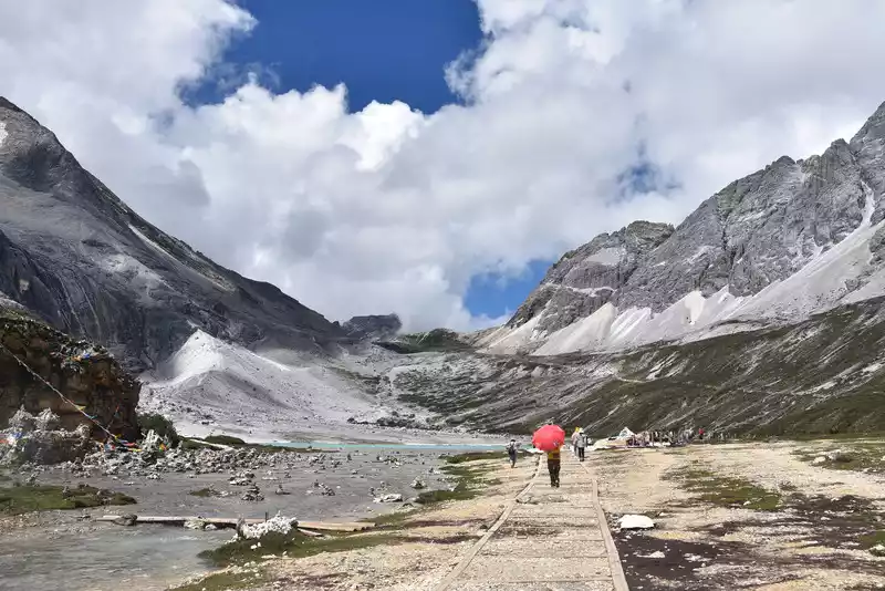 After breakfast at the hotel at 7:00 AM, we walked to the scenic spot to purchase tickets. The scenic spot opens at 7:00 AM. Daocheng Yading has two routes: the long route and the short route. The long route runs from Chonggu Temple to Luorong Cow Farm, then to Milk Lake and Five-Colored Lake, covering a total of approximately 11 kilometers, from 4,100 meters above sea level to a peak of 4,700 meters. The short route runs from Chonggu Temple to Pearl Lake, covering approximately 1.5 kilometers and traversing plank roads, making it a relatively easy hike. It's best to spend two days completing both routes. The ticket is valid for both days, but you'll need to purchase a half-price sightseeing bus ticket for 60 yuan on the second day. The distance from the scenic area entrance to Chonggu Temple is approximately 33 kilometers, and the bus ride takes about an hour. The bus travels halfway up the mountain, offering breathtaking views of seas of clouds and snow-capped mountains. The scenery is both beautiful and precipitous.