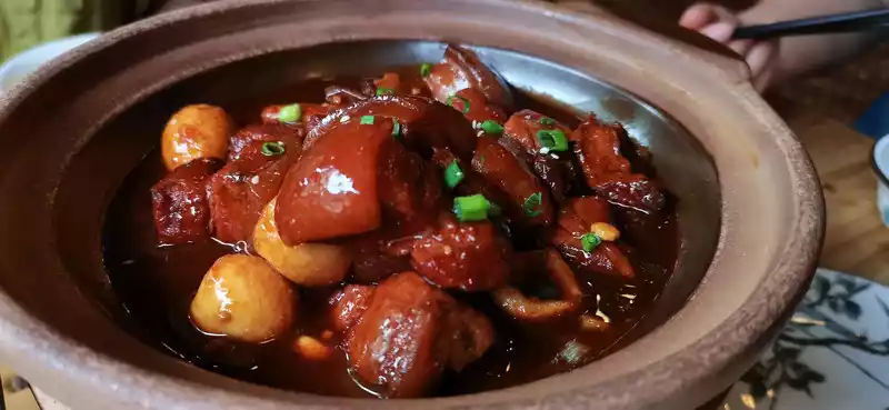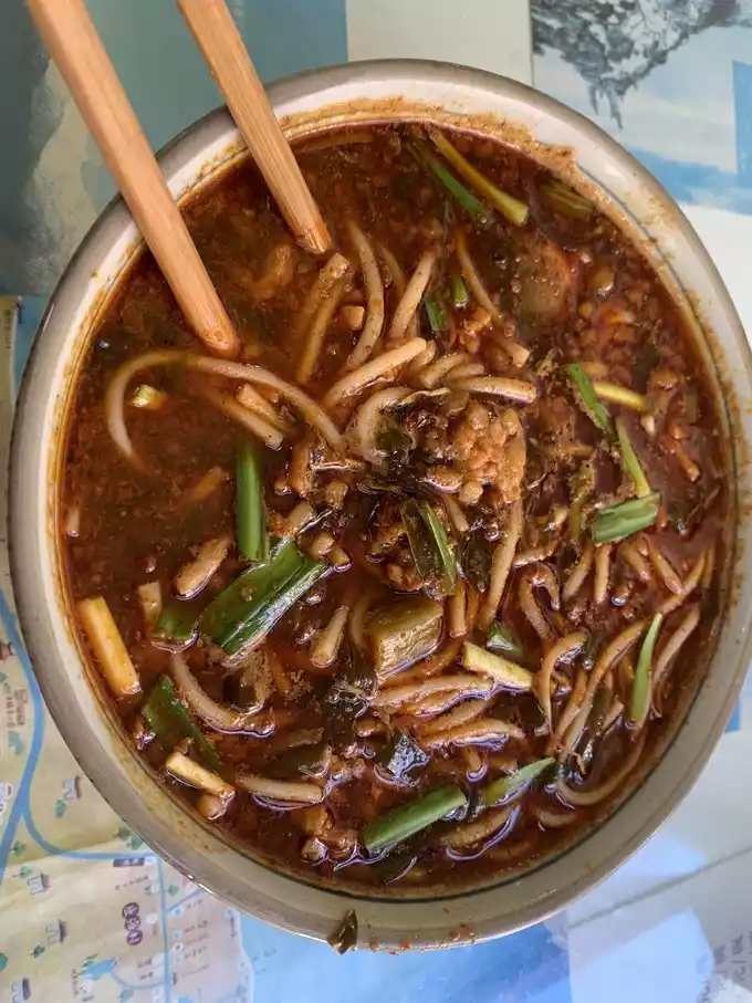 For brunch, we chose a highly-rated beef rice noodle restaurant near our B&B. We even walked around Wanda Plaza to find it. The rice noodles come in small and large bowls, and the difference between them was about 2/3 liang. Both were quite filling, and you could choose your own seasoning. The restaurant also provided local seasoning methods, and the taste was very authentic. On the left side of the entrance, you'll see a large pot of beef and bone soup, and on the right, a variety of braised dishes. The average price per person was around a dozen yuan. I also ordered a platter of braised vegetables. The dipping sauce was probably Danshan dipping sauce, with very fragrant chili powder, the kind that becomes more fragrant the more you chew it.