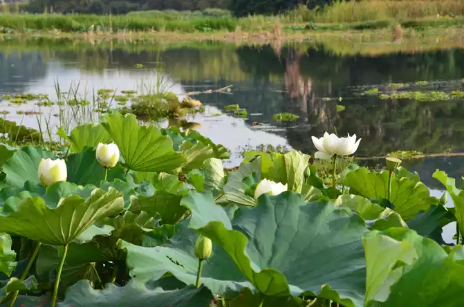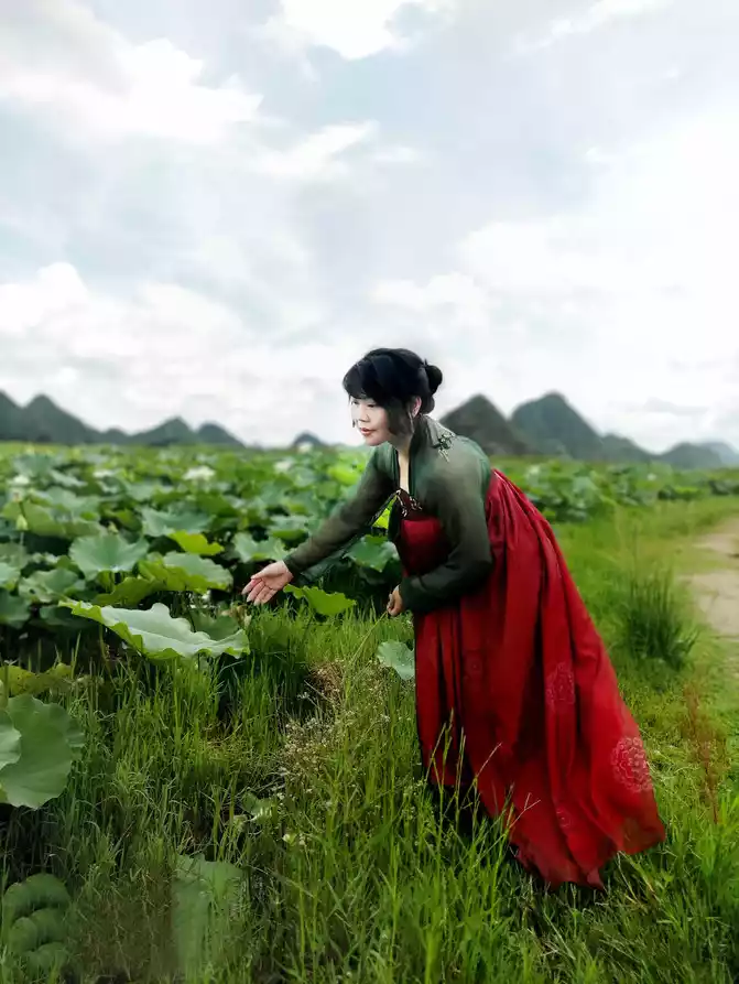 The advantage of traveling independently is that you can change the itinerary at will. We did not buy tickets or take a boat. (Because the scenic area is large, there are many kinds of ticket packages, mainly electric cars and boating, which cost 200 yuan per person.) We asked the store to contact a private car to go to the Ten Thousand Acres Lotus Garden and pass by the Swan Lake Scenic Area. We walked 2 kilometers. The sky was blue and the clouds were white. Cars of tourists drove by along the way. We envied them for enjoying the cool breeze, and they envied us for walking in the lotus fields. The Wanmu Lotus Field Scenic Area has also been fenced off, costing 30 yuan per person. We found that the scenery inside the fenced-off area lacked the scattered landscape, so we didn't enter the area. We walked around the outside of the fence instead. On the path, we happened to see a few girls in Korean costumes taking pictures, so we secretly snapped a few more. :) It seems that it's the eyes that matter most to discover beauty! The lotus flowers outside the fence, unenclosed, are even more graceful!