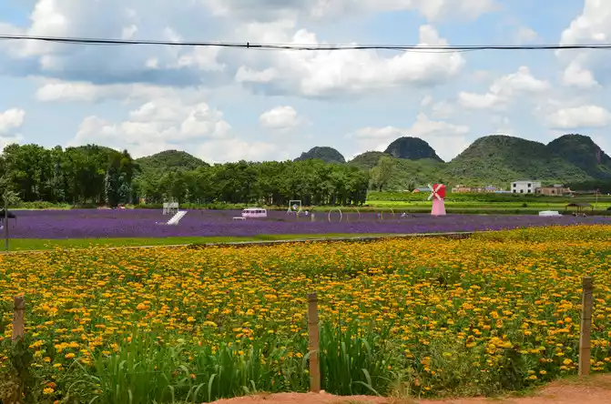 The bus first went to Hundred Flower Valley. It took just over 10 minutes. Hundred Flower Valley boasts a variety of flowers, including safflower, lotus, and chrysanthemums. There were props in the sea of flowers, perfect for outdoor photography. We arrived at 12:00 PM, and it was too hot at noon! It was just outside the wire fence, so a distant view was enough.