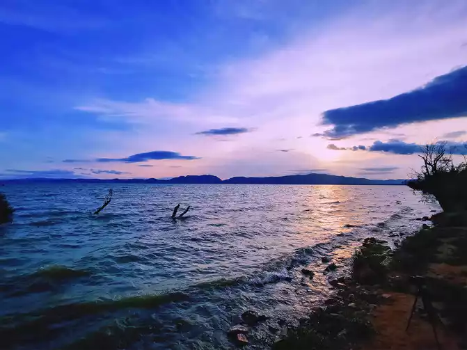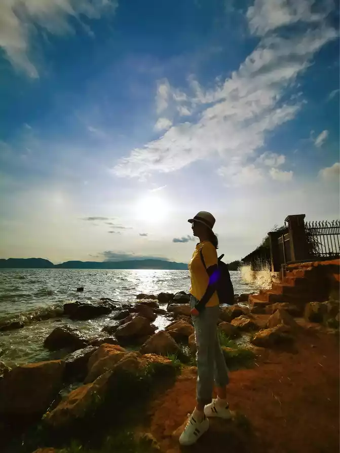 The hotel is just a stone's throw away from Yihe Road subway station. We waited until the afternoon sun was not too strong before we made an appointment to go out and stroll around the nearby Guandu Ancient Town. Guandu Ancient Town boasts a pure and ancient charm. Despite its relatively small size, less than 1.5 square kilometers, it has been a renowned ancient ferry crossing in central Yunnan since the Nanzhao Dali Kingdom era. It was already a major market town on the east shore of Dianchi Lake during the Tang and Song dynasties. Established as a county alongside Kunming during the Yuan Dynasty, it became a prosperous commercial township during the Ming and Qing dynasties. Once a gathering place for merchants and shimmering towering pagodas, Guandu became a popular destination for high-ranking officials to build palaces and villas, and a popular destination for celebrities and dignitaries. Many cultural relics remain today, including five mountains, six temples, seven pavilions, and eight shrines from the Tang, Song, Yuan, Ming, and Qing dynasties. The Vajra Pagoda of Miaozhan Temple is the oldest of the more than ten existing Vajra Pagodas in my country. It is the only typical Lama-style pagoda built entirely of sandstone. It is said that a snail-lion monster once caused trouble in Guandu, so the pagoda was built to suppress it. There is a two-story stage on the north side, which complements the two dense-eaves brick pagodas of Miaozhan Temple. It not only embodies the Buddhist spirit of "greatness comes from tolerance" and "the combination of exoteric and esoteric Buddhism", but also has a "品" layout, with buildings of different heights, magnificent and spectacular, forming the core of the ancient building complex in Guandu Town. The bottom of the base spans the air, with four gates in the east, west, south and north connecting them, allowing the passage of pedestrians and vehicles. A small square pagoda is built at each corner, guarding a tall conical pagoda in the middle. The five pagodas represent the Five Buddhas, and the main pagoda in the middle represents Vairocana Tathagata. The main pagoda is tall and handsome, and the five pagodas stand in a cluster, complementing each other with exquisite carvings. The entire stone pagoda is imbued with the aura of religious culture and the charm of architectural art. Miaozhan Temple has two towers, one in the east and one in the west, about 15 meters apart. Both towers are light yellow in color, 13 stories high, solid brick towers with dense eaves. They were first built in the Yuan Dynasty and rebuilt many times. The west tower was destroyed by an earthquake in the 13th year of the Daoguang reign of the Qing Dynasty. The east tower still survives, and the current west tower was rebuilt in 2001. The towers stand 17.5 meters tall, crowned by a bronze Garuda bird to ward off floods. Legend has it that every 60 years, on the evening of the autumnal equinox, as the sun sets and the moon rises, the twin towers complement each other's beauty, rivaling the Golden Horse and Jade Rooster. While Guandu Ancient Town may be overly commercial these days, the local residents still enjoy their surroundings, treating the town as their own playground. Surrounding the Fading Temple, Tuzhu Temple, and Miaozhan Temple, there are always crowds of people, playing stringed instruments and singing, each one immersed in the music. Dian opera, lantern displays, folk songs, and folk songs are performed one after another, while others pull out their chess and card games, gather friends, and relax. The sun was setting. Unaccustomed to the hustle and bustle of the ancient town, we hurriedly left and headed to Wangguan Wetland Park to look for a beautiful sunset. Dianchi Lake is dotted with over a dozen wetland parks, large and small. Wangguan Wetland, famed for its stunning sunset photos on Xiaohongshu (Little Red Book), is known as Kunming's "Little Jeju Island." The park is small and unique, offering waterside strolls along the lake's shore or a wetland trail across the lake, complete with a floating plank road and underwater reflections, surrounded by lush greenery. Whichever route you choose, you'll enjoy the comfort of watching the waves crash against the shore and the rolling clouds. You'll also feel the gentle breeze, bringing the nourishing scent of water, flowers, and earth, bringing a touch of freshness to those strolling through the scorching summer heat. Standing on the shore, the water shimmers endlessly, waves crashing against the rocks, withered trees swaying in the water, and the lonely old tree standing alone in the water, adding a touch of melancholy.
