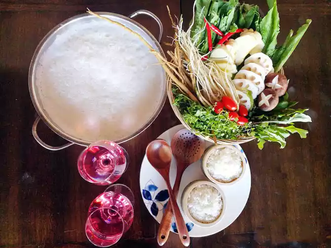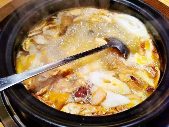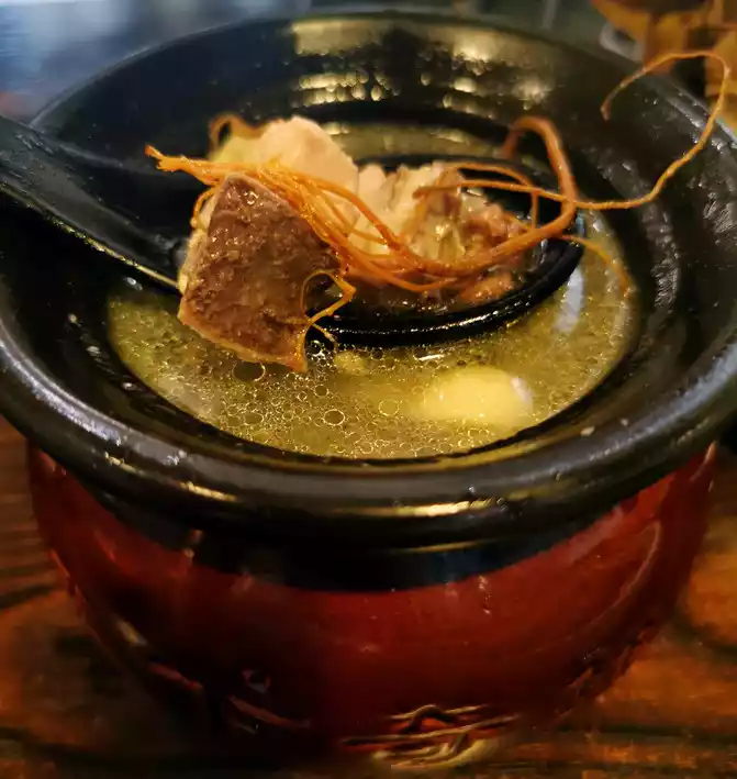 A wild mushroom hot pot. I didn’t know much about the various mushrooms in the wild mushroom platter. The waiter introduced them one by one, then poured the pot full of mushrooms into the hot chicken soup pot, and put a small timer on it. Next to us, we were told not to touch any ingredients in the pot with our own tableware before the time was up, so we waited and waited. The overflowing steam was so fragrant that our saliva flowed three thousand feet straight. The timer finally went off. To ensure the safety of diners, samples of each soup pot were taken. After keeping it for 48 hours, you can finally eat it. Stir it gently and then drink a full bowl of mushroom soup. The soup is rich and delicious, sweet and nourishing. The freshly cooked mushrooms melt in your mouth. In terms of taste, I love the red milk porcini mushrooms the most. They are smooth and crispy. After finishing the chicken and mushrooms We cooked some wild vegetables, which were also very delicious. The set meal for two came with drinks and desserts. It was so rich. After queuing for more than 40 minutes, we were given two baskets of steamed matsutake dumplings. We had to eat them while they were hot. The dumpling wrappers were crystal clear and chewy, and the dumpling fillings had a strong matsutake flavor.
