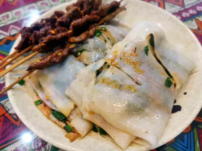 Puzhehei at night is all about barbecue, and I couldn’t find a bowl of rice noodles. The locals said they only eat rice noodles for breakfast, so we went to the Four Seasons BBQ and randomly ordered a few skewers of roast beef and a plate of baked roll noodles. We were unexpectedly surprised by the deliciousness of the grilled roll noodles. The minced chives wrapped inside were salty and delicious, with a wonderful texture and unique flavor.