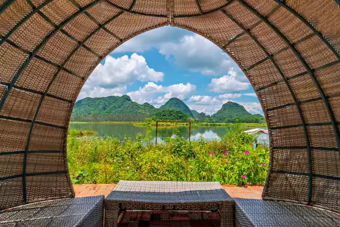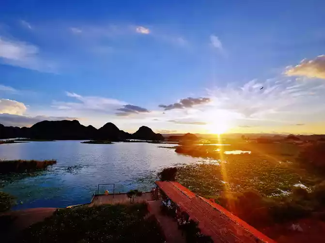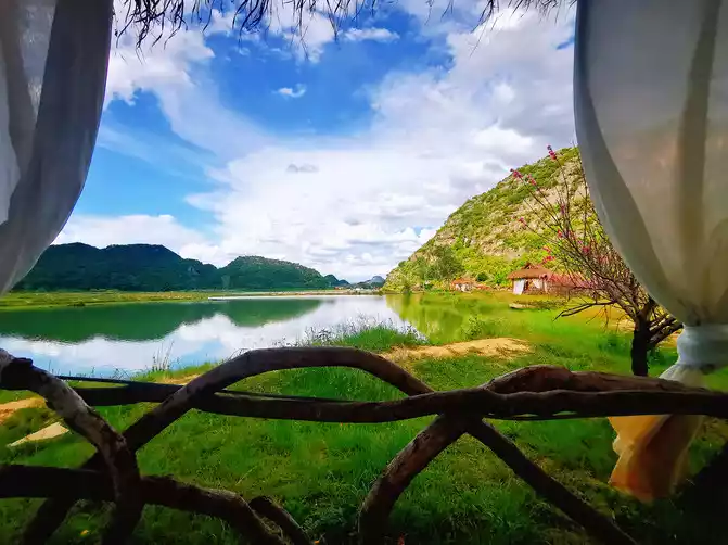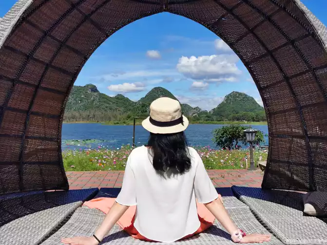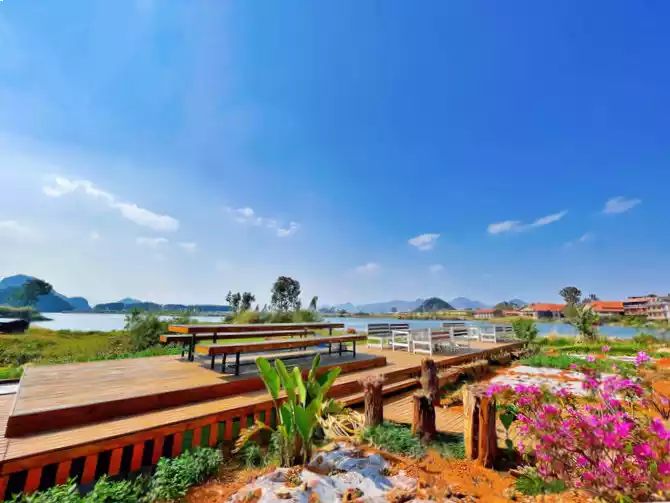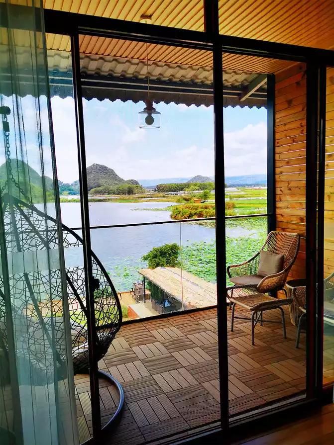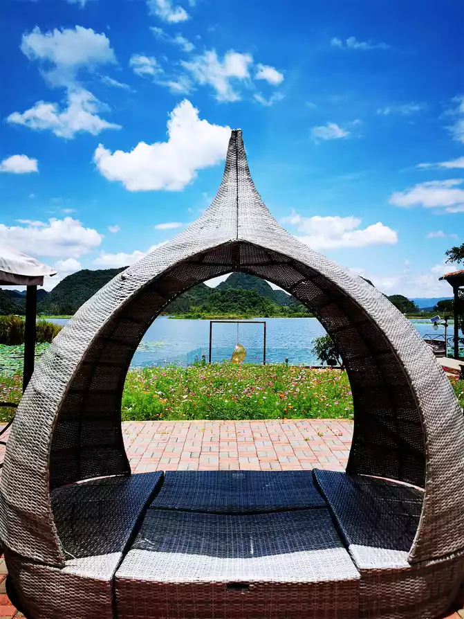 In the early morning, after enjoying a delicious breakfast and hot rice noodles, the hotel specially sent a car to take us to Kunming South Railway Station. There is a direct high-speed rail from South Station to Puzhehei, and the whole journey takes only about 1 hour, which is very convenient. Puzhehei High-speed Railway Station is located in Qiubei County. You can take Didi to reach our inn - Huazhu Puzhehei Yunbanghua Qingsu. The inn's courtyard is quiet and elegant, with vast expanses of flowers and meticulously decorated interiors. The view offers a 180-degree, perfect mountain, water, and lakeside vistas. Lotus Lake and Qinglong Mountain showcase their beauty, while distant mountains, lotus leaves, blue sky, and white clouds are all within your view, creating a scene you feel as if you were enjoying your own private life. The third-floor bedroom features oversized floor-to-ceiling windows. Lazily lazing in a rocking chair on the balcony, brewing a pot of tea, opening a book, and savoring the tea in peace and quiet—this idyllic rural life, far from the hustle and bustle, is exactly what we wanted. This distinctly different lifestyle from the city, where we can watch the flowers bloom and fall in the courtyard and the clouds roll and unfold in the horizon, makes us reluctant to get up again. Although the inn is at the end of Puzhehei Village, a certain distance away from the bustling village center, it is precisely because of this that it can enjoy a unique quietness. Although the road in front of the courtyard is dusty and has many potholes, the advantages outweigh the disadvantages. What's more, the housekeeper always lets us borrow the store's electric scooter for free, which makes it very convenient to go anywhere.