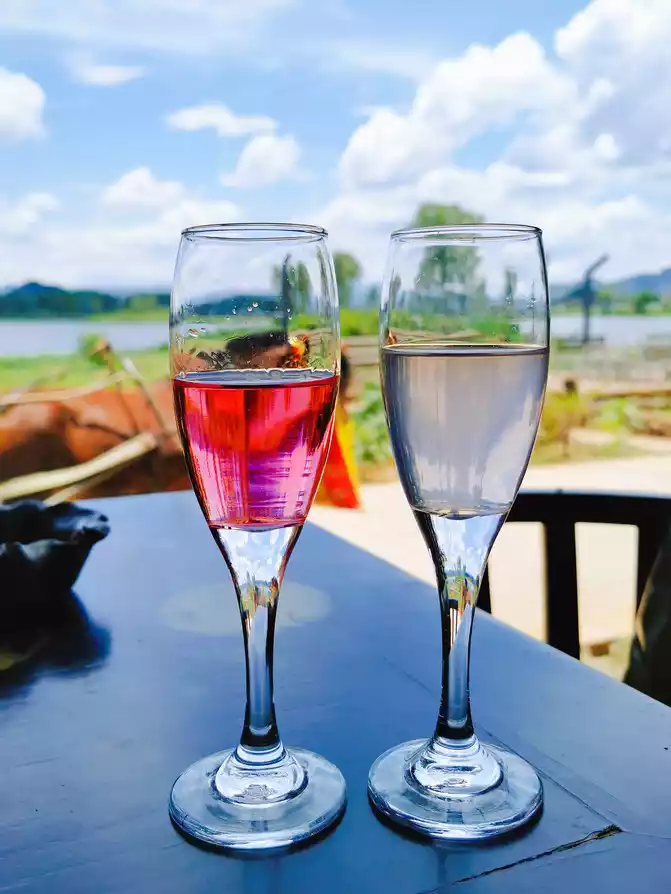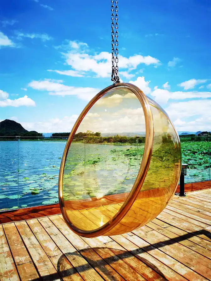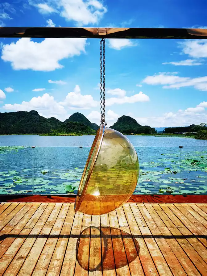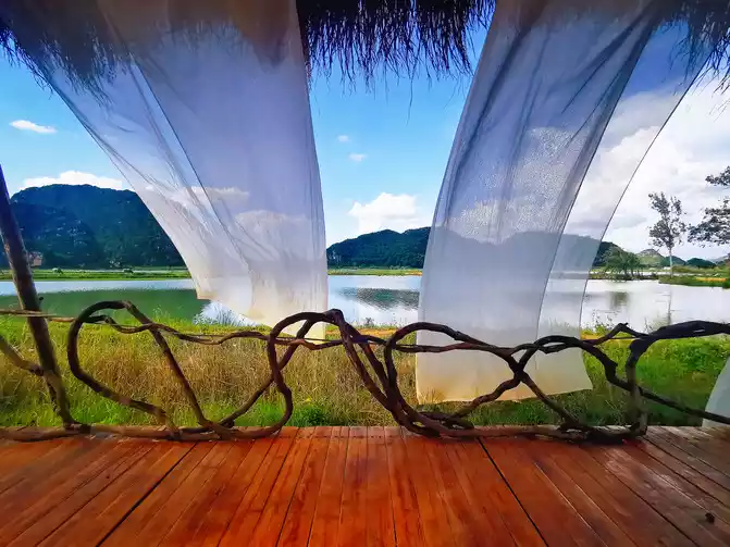 I am about to return today. I slept until I woke up naturally in the morning. I didn’t want to go anywhere. I just wanted to stay quietly in the inn. The inn in Nuoda was empty. All the guests had gone out to play. We were the only two sitting by the lake with a tripod. We started taking selfies and took pictures casually. People were in the scene, and everything around them became props. The rattan bed, glass swing, wine bottle, water gun... The two of them got carried away and had a great time. I think this is the true meaning of relaxation!