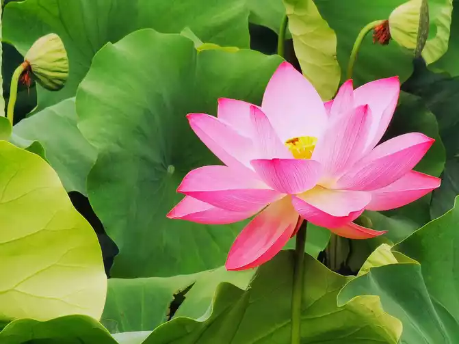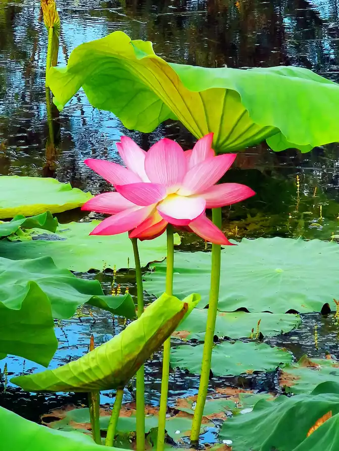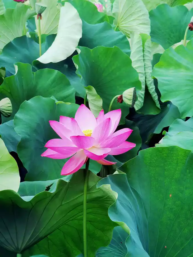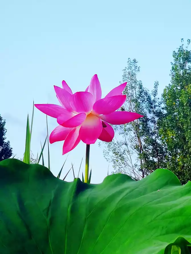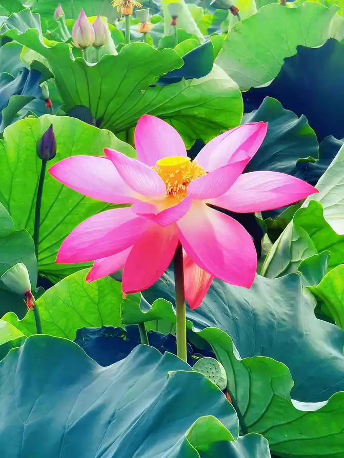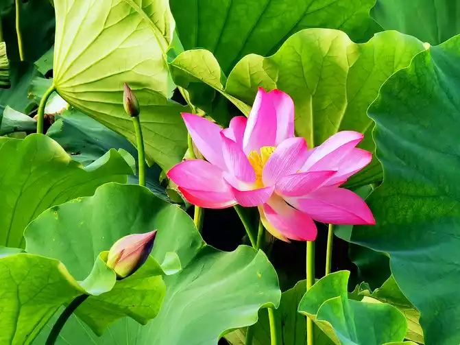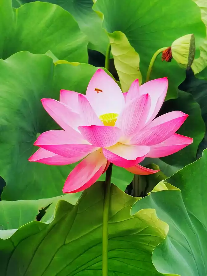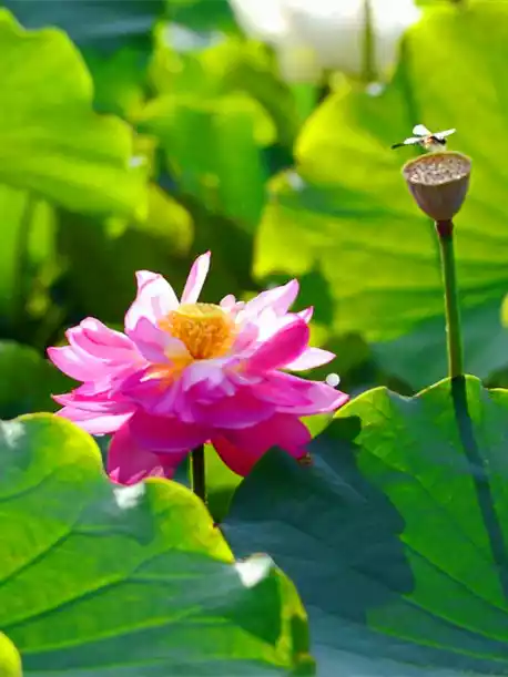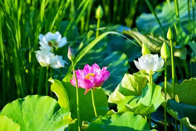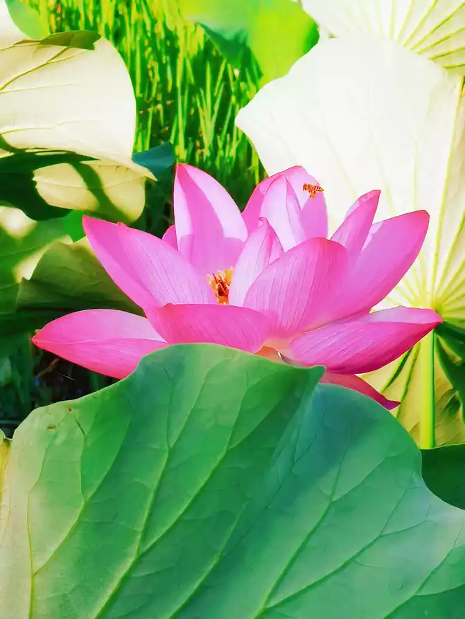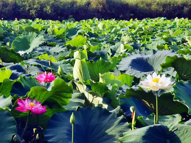 I woke up early in the morning, the warm morning sun shone on the lake, and the air was filled with the unique fragrance of lotus. I strolled along the lakeside, surrounded by lush green. The lotus swayed its body and danced gently, like a graceful and charming girl. The pink, crimson and white petals each had its own charm, and the warm yellow flower core was embedded in them, elegant and quiet. From time to time, bees flew over to collect nectar, and large lotus leaves stretched out unscrupulously.