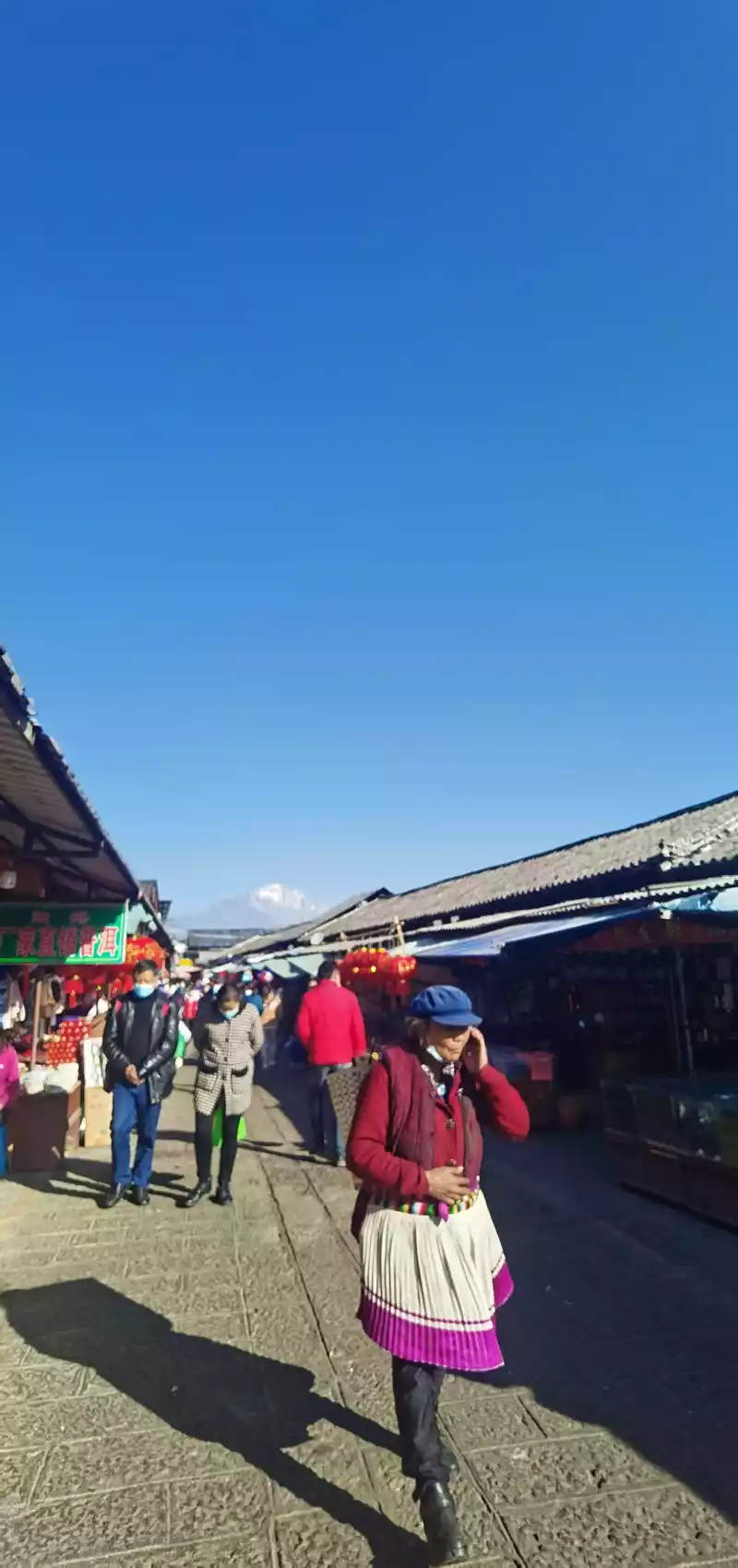 Busy shopping for New Year's goods, with Jade Dragon Snow Mountain in the distance.
