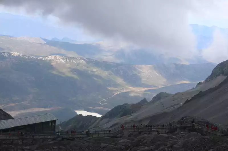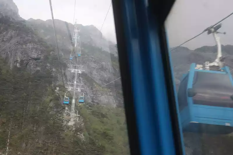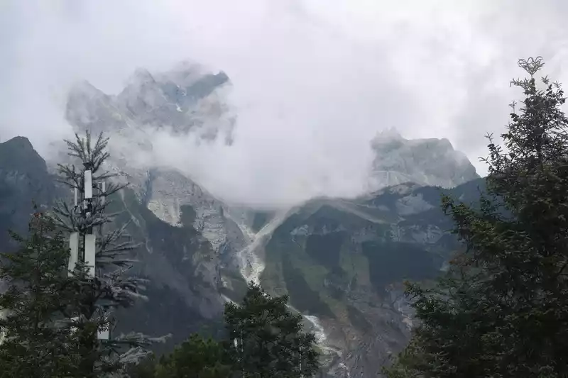 The water in Blue Moon Valley isn't actually blue, but a clear green. It meanders down through lush trees, creating a lush green scene. With the mist-shrouded snow-capped mountains as a backdrop, it's a truly pleasing sight. After taking the cable car from the 3365m platform on a clear day to the 4506m platform, it suddenly started to drizzle and dark clouds covered the sky. After stopping for a while, everyone continued to move forward towards the plank road, as if walking through a fog, stopping and resting. Altitude sickness varies from person to person, so please proceed according to your ability.