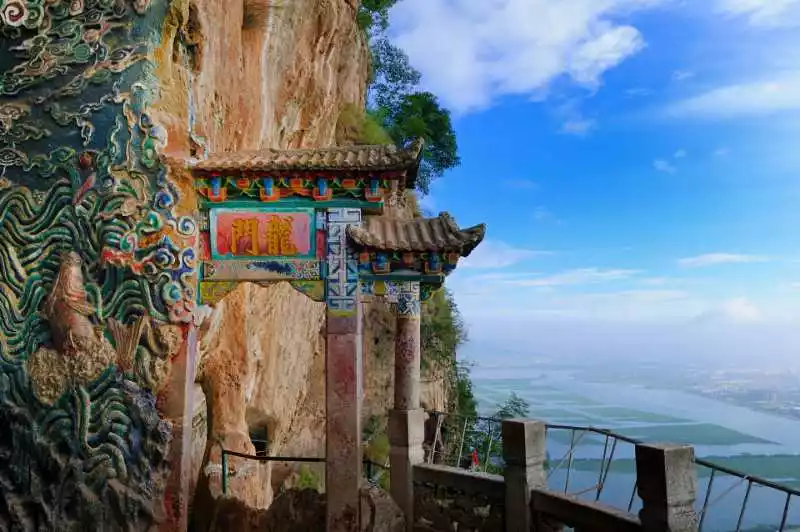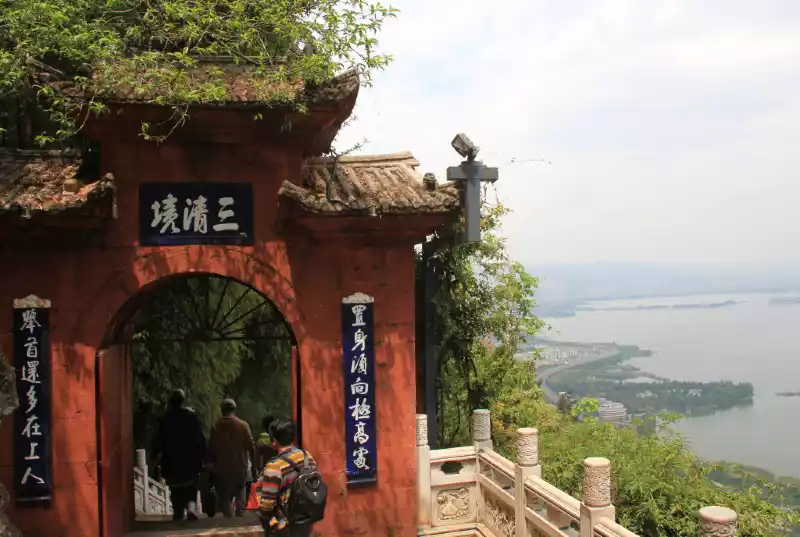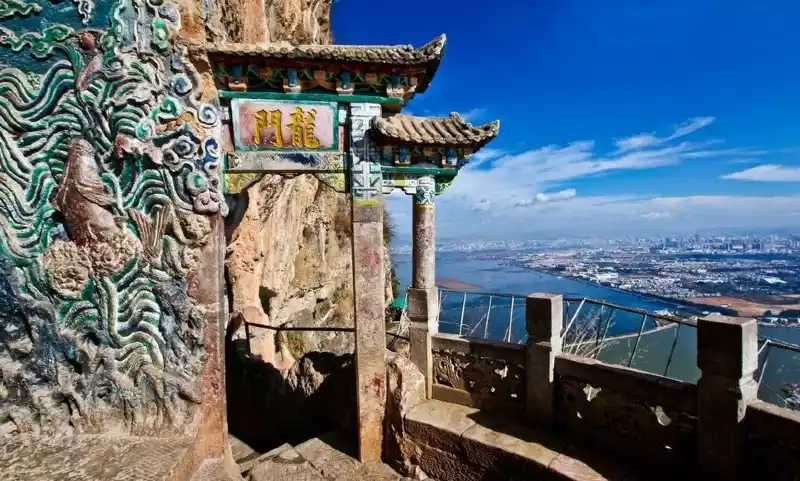 Sanqing Pavilion stands on a steep cliff, a cluster of pavilions dotted among the lush greenery. These pavilions, comprising nine stories and eleven wooden structures, include the Lingguan Hall and Laojun Hall. The Longmen Scenic Spot, characterized by its unique beauty, uniqueness, danger, and seclusion, is the most famous of Kunming's West Hills. It enjoys high international and domestic recognition and is a must-see for every visitor to Kunming. As the saying goes, "If you don't visit West Hill, you haven't visited Kunming, and if you don't visit Longmen, you've wasted your trip to West Hill."