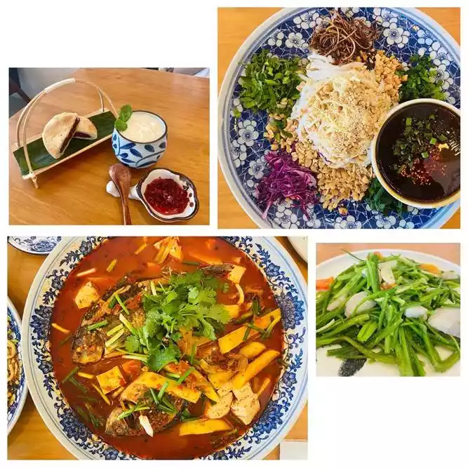 This is Shuanglang. No matter which scenic spot in Dali, it looks super beautiful. It was already noon when we arrived in Shuanglang, so we decided to have lunch there. There's a Shuanglang Corner Time Garden restaurant there. It's well-reviewed, and the dishes we ordered were based on recommendations from a reviewer. We had chicken gravy rice noodles, flower pancakes, and stir-fried seasonal vegetables, all of which were quite delicious.