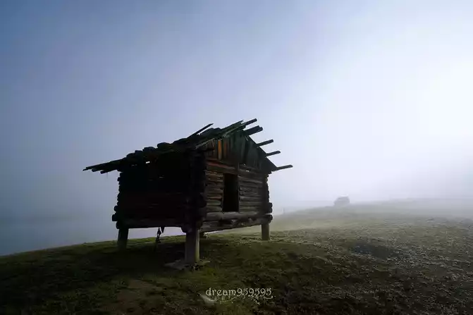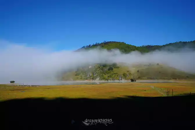 D2 10.1 Dingdong Lake, Kangwu Temple, Changhaizi, Muli Temple, Mana Chajin. Accommodation: Mana Chajin. Dingdong Lake. The drive took over an hour up the mountain road. From outside the valley, it looked like a sea of clouds. Upon arrival, the lake was shrouded in fog. Perhaps it's named Dingdong Lake because of the ding-dong-dong sound of cowbells that could be heard from across the river. The moment the morning mist lifted was truly magical. From the other side, it was completely invisible, but gradually, the view became clearer. All it took was waiting.