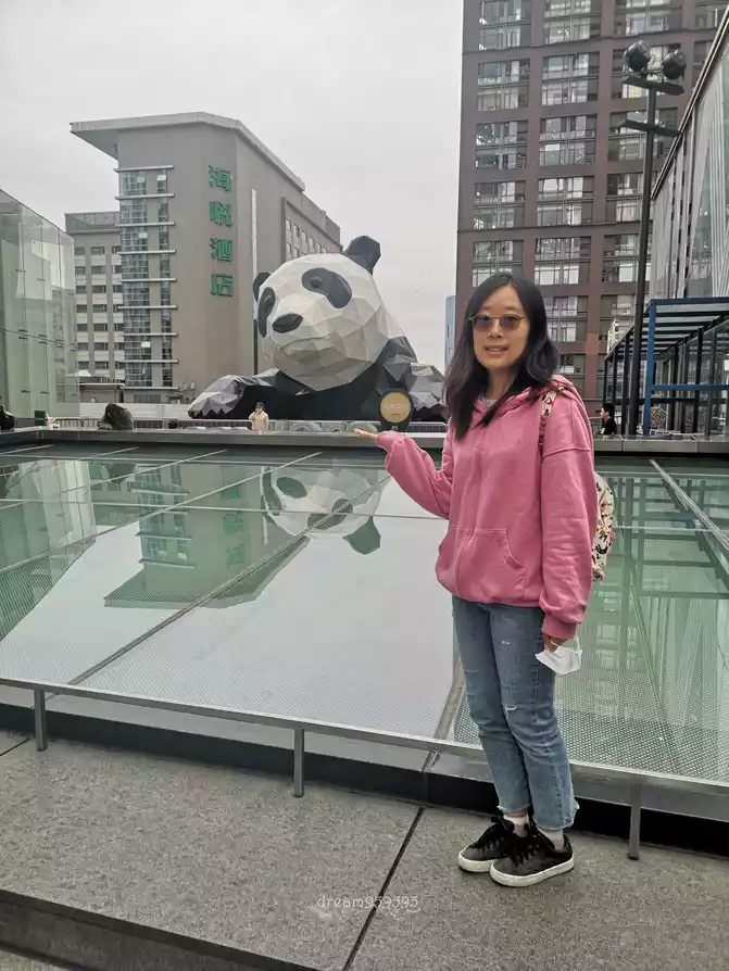 When we arrive in Chengdu, we first check out an Internet celebrity landmark, the giant panda at IFS. You can see the panda’s butt downstairs, and you can see the giant panda in front from the terrace on the 7th floor. Many people are queuing up to take photos, so let’s just take a photo next to it.