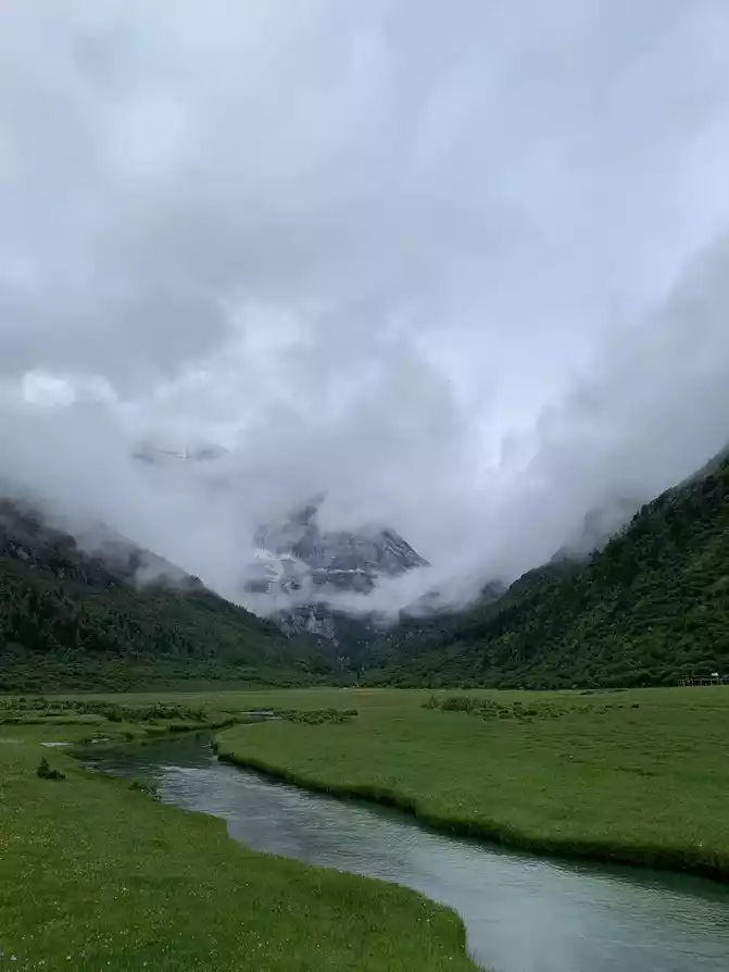 After entering the Yading Scenic Area, we didn't see the sign clearly, so we drove down and asked the owner of the B&B before returning to the scenic area. Shrouded in mist, Mount Xiannairi looks mysterious and beautiful. From the Chonggu Meadow, a natural bonsai landscape, you can overlook Mount Xiannairi, a mysterious and beautiful sight. The meadow boasts clear water and lush green grass. Not many tourists lingered here, so we wanted to stay an extra day in the scenic area, so we took a leisurely stroll. We then took a short trip to visit Zhuoma Latso on Xiannairi and pay homage to the deities at Chonggu Temple. Here, people and animals seem to coexist harmoniously. Needless to say, the monkeys were incredibly lively. Passersby kept throwing food to them, and the mother monkey, carrying her baby on her back, was the most active, following them everywhere and eating endlessly. A tit accompanied us all the way up the mountain, but we surprisingly didn't bring any food. While there's plenty of food for it in the mountains, it felt a bit sorry that we couldn't offer it a "Western meal" because it was so commonplace.