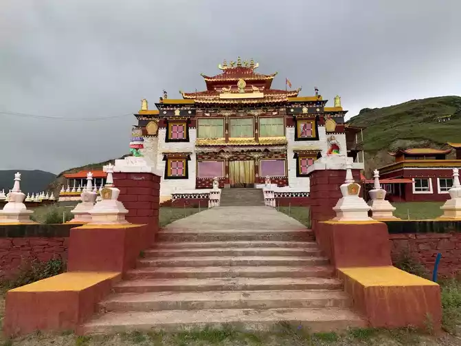 As expected, it began to rain, with sparse, heavy raindrops pounding down. We took shelter beside the prayer wheels. There were many yaks on the way to the Buddhist college. One yak kept making "hmm-hmm" sounds, as if declaring its sovereignty. Dafang was walking in front, and about ten meters behind it was a yak with curved horns, walking slowly. I was walking parallel to the yak, less than five meters away. Because of the high altitude, we were all walking very slowly. Suddenly, the yak started running. I was frightened and shouted to Dafang, "Get out of the way!" Dafang quickly turned around, but before he could react, the yak stopped running. When the yak started running again, Dafang was ready. If the yak got angry, there would be nowhere to hide, and it could throw itself into the diversion ditch beside the road at any time. The yak, with its agile body, ran through the metal fence and went home. It turned out to be a false alarm. The Gaoer Temple's Esoteric and Exoteric Buddhist Scriptures Institute was off-limits. We went to spin the giant prayer wheel, nearly ten meters tall. Its golden body gleamed brilliantly in the sunlight, and we used all our might to get it spinning.