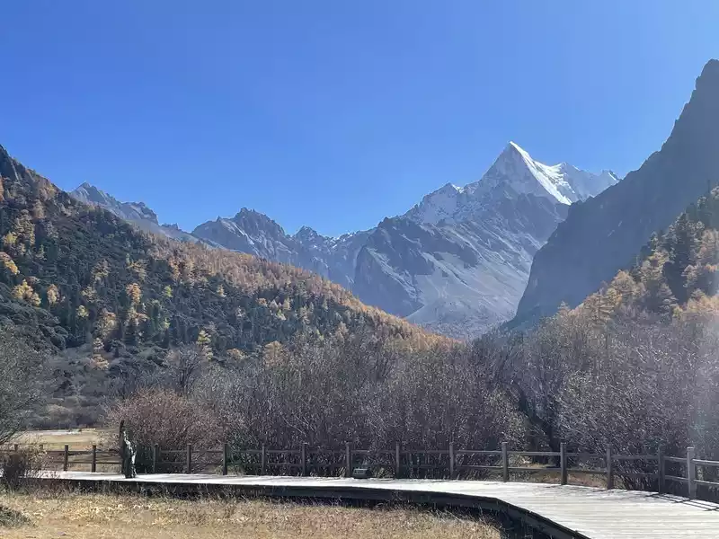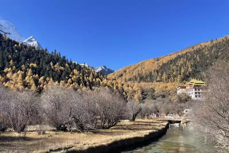We woke up at 7:30 a.m. for breakfast. The landlady told us it wasn't necessary to go up the mountain so early in November because it was very cold. We took the 8:45 a.m. bus up the mountain and finally arrived at Chonggu Temple after 38 turns. Here we saw the first sacred mountain, Shanuoduoji. Due to the bright sunshine that day, we didn't have a good location to take photos of Shanuoduoji.
