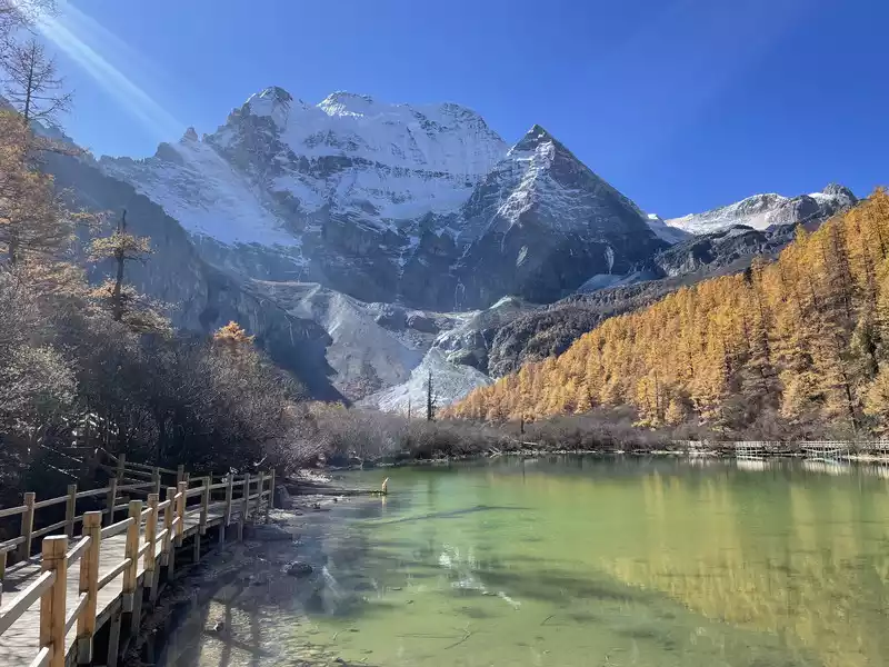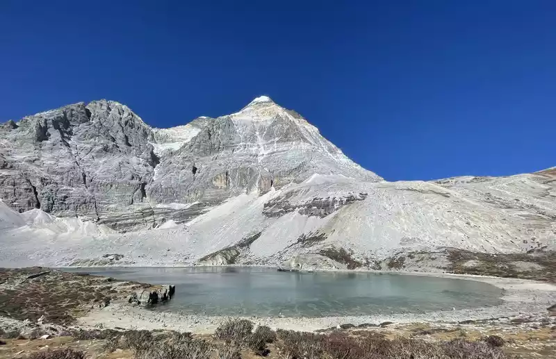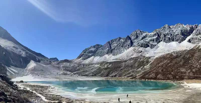 After walking for about an hour, you will see a deep green lake. Don’t mistake it for the Milk Sea (it’s still early), this is an artificial lake. It is the best place to view Yangmaiyong (Manjushri Bodhisattva). After another two hours of climbing, we finally reached our first lake, Milk Lake. At an altitude of 4,600 meters, the temperature reached -5°C. Since there were only a few hikers that day, we were probably the first group to reach it. It was strange that Milk Lake wasn't white, but green, and it was already frozen. But that didn't diminish its beauty. Forgive my photography skills; the scene still left me awestruck by nature's uncanny craftsmanship.