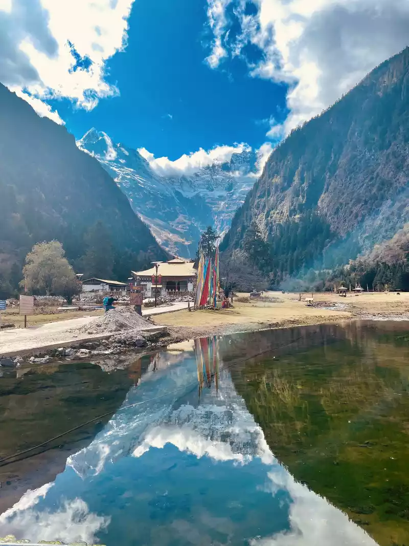 After a night of rest and recovery, we packed our belongings (we were the last guests of the year; after cleaning up, the owner's wife was heading back to Northeast China for the Lunar New Year). We drove to the main gate of Yading. Since our Yading ticket was valid for two days, we only needed to buy a 60-yuan bus ticket the next day to ascend the mountain. The journey took about the same amount of time as the first day. We started at Chonggu Temple and headed to Pearl Sea, which is only 4,060 meters above sea level and takes an hour and a half round trip. Here we saw the third sacred mountain, Xiannairi (Avalokitesvara Bodhisattva). The Pearl Sea was clearer than the other two lakes.