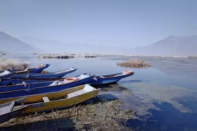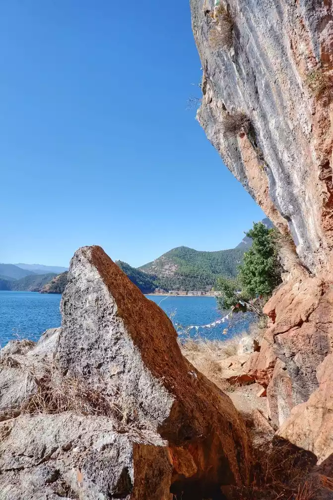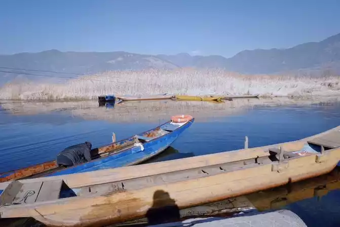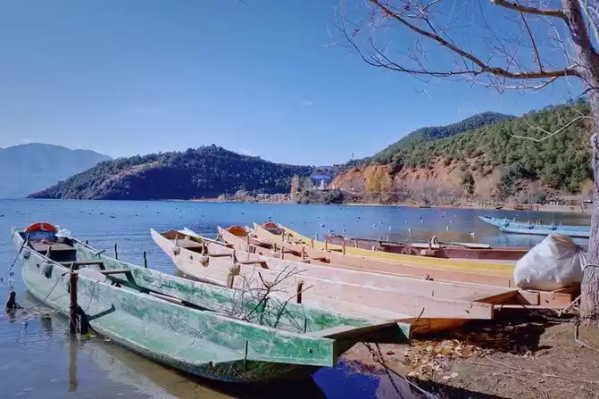 Searching for the source of Lugu Lake. It is said that the source of Lugu Lake is called Luyuan Cliff. From the village dock, board a pig trough boat and head toward the cliffs, encountering the clear water along the way, its ripples shimmering in the winter sun. Luyuan Cliff is the source of Lugu Lake and the outlet of groundwater, reaching depths of over 90 meters at its deepest point. Standing amidst the jagged rocks, beneath the cliffs, gazing out at the distant scenery of Lugu Lake, the village becomes a picturesque scene. The fluttering colorful prayer flags and the Mani stones of small stones bear witness to the religious and cultural imprints on this mysterious plateau lake, and bear witness to the intertwining of humanity and nature over time. In Yunnan's Lugu Lake area, the Mosuo people once relied on a canoe called a pig trough boat. These simple wooden boats, crafted from locally sourced large logs and hollowed out, are slender and T-shaped at both ends, earning them the name "pig trough boat" because of their resemblance to a pig trough.