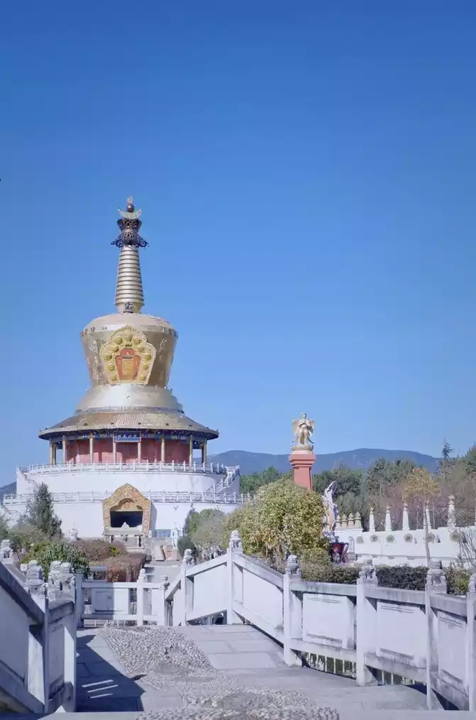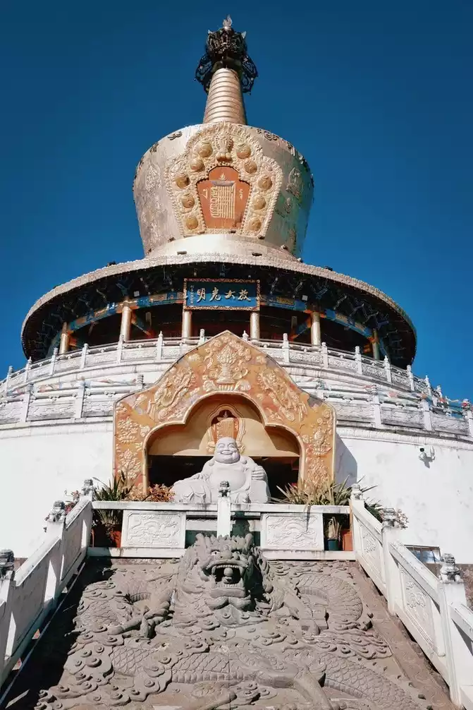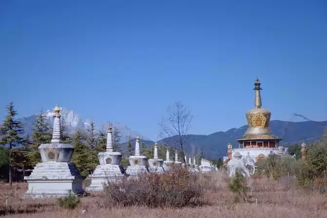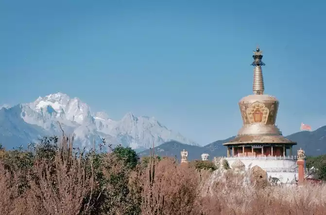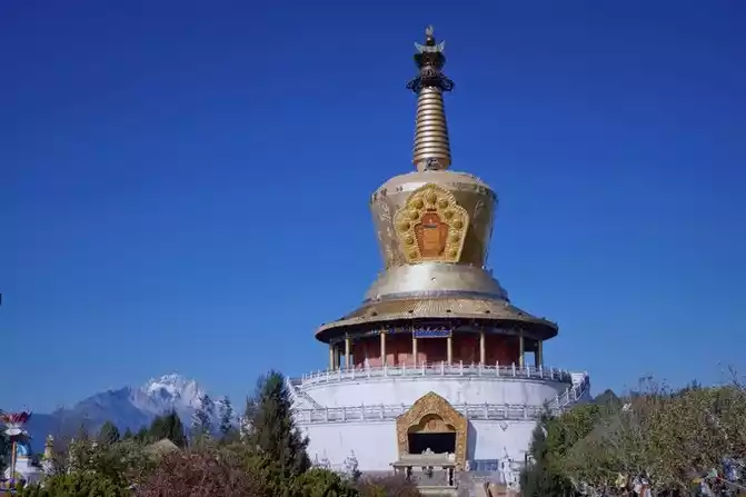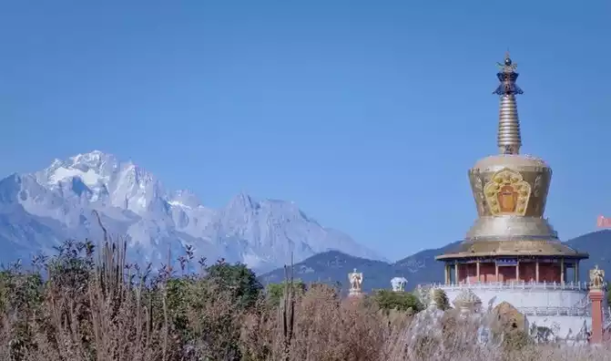 The Shwedagon Pagoda stands atop Snake Mountain in Lijiang city, facing Jade Dragon Snow Mountain in the distance, offering breathtaking views.