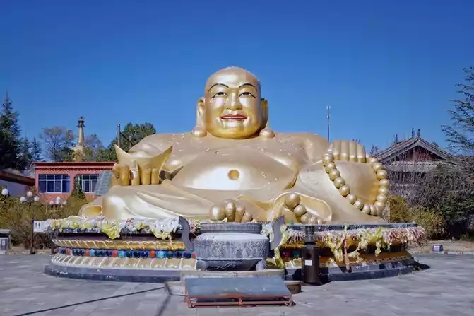 The five-colored prayer flags hanging within the temple create an exotic atmosphere. Tibetan Buddhism is characterized by its golden roofs, with smaller stupas surrounding a larger one.