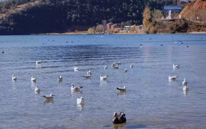 Inadvertently, they spread their wings, soar into the sky, then dive down quickly. Lugu Lake's winter temperature remains as warm as spring for the gulls.