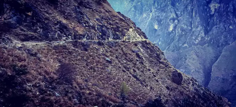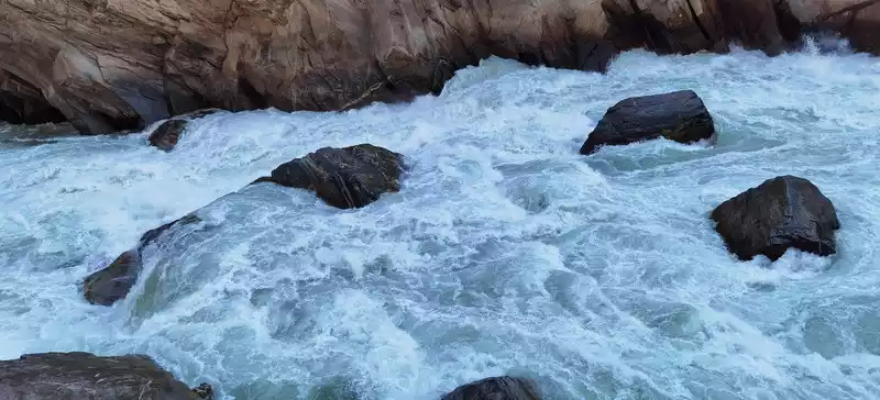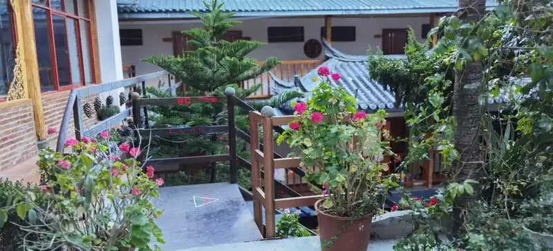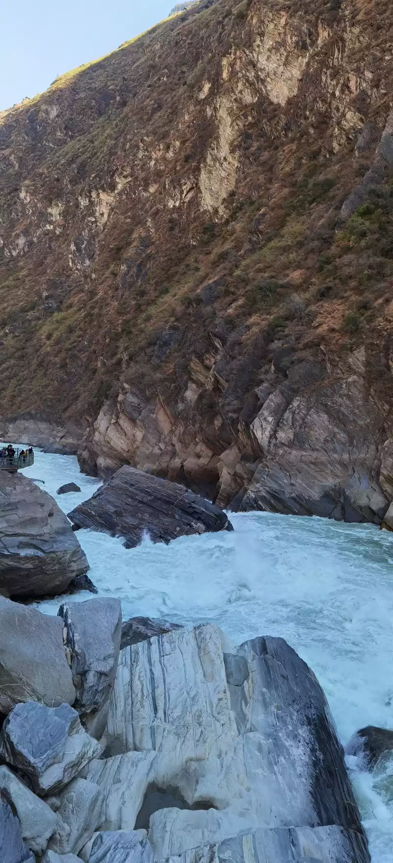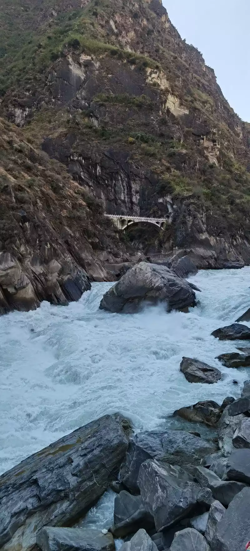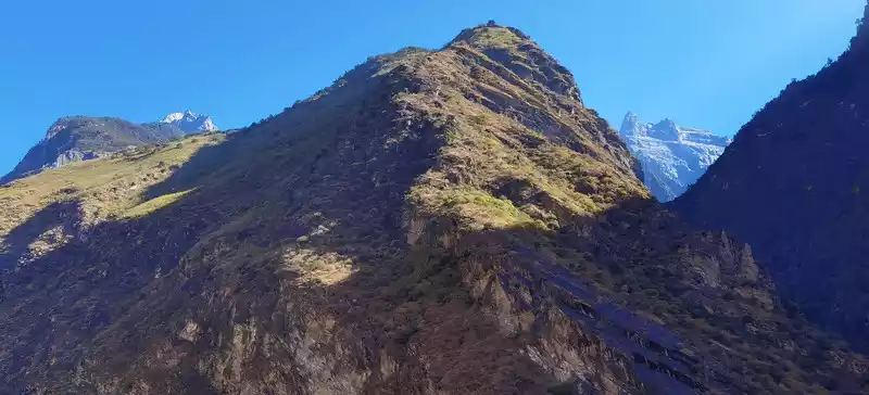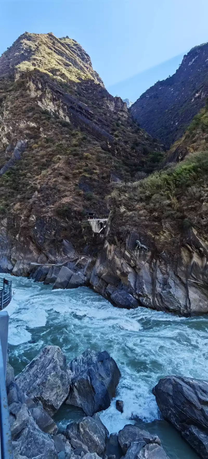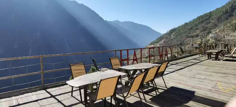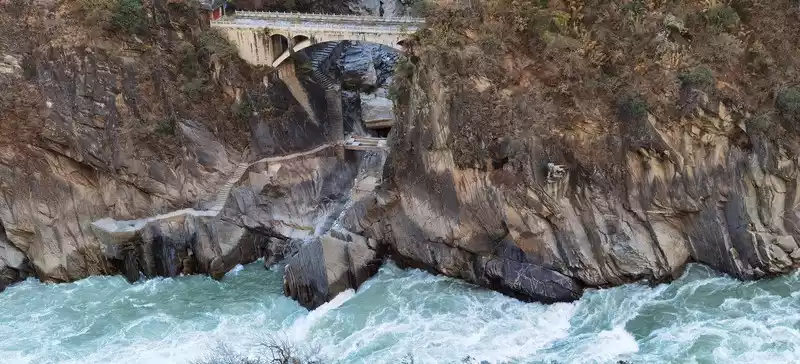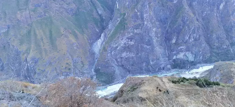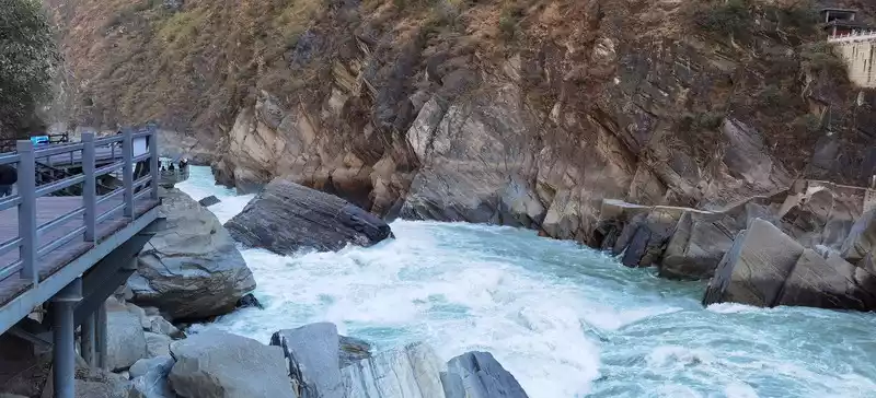 The tiger jump is marked by the inn of Mr. Zhang (he was a school teacher before opening the inn) and was developed by the villagers. This teacher Zhang built a path down the river on the hillside, called "Teacher Zhang's Trail", which took more than three hours to walk up and down. In order to provide convenience for travelers who want to take shortcuts, some people built a "ladder" with wooden sticks and angle iron rebars, more than 20 meters high, almost vertically up and down. The two trails each charge their own fees, and they are 20 yuan for a walk. Some people have built a suspension bridge on the rocks in the middle of the river, and those who are bold can go up to the boulders to take pictures. The tiger jump is completely undeveloped, and can only be seen on the hillside path. If you want to go down to the river, you need to do some outdoor rock climbing.