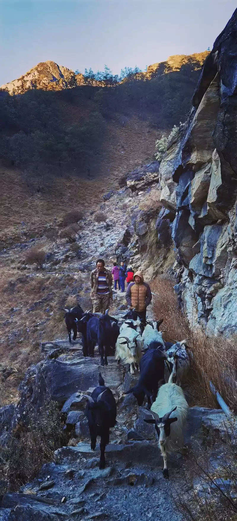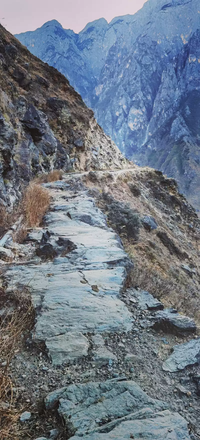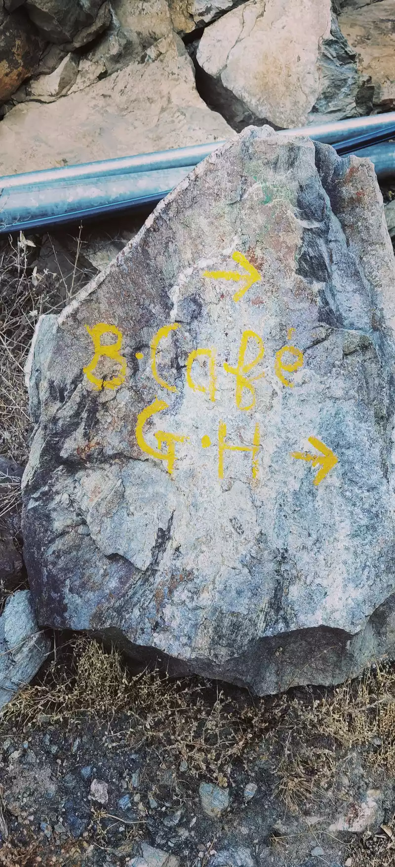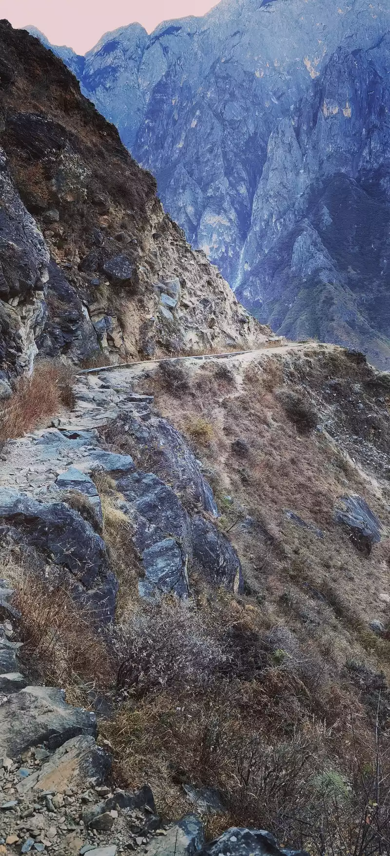 downward It is precisely because the eastern edge of Haba Snow Mountain is relatively not so steep, and there is a sheep intestine path on the hillside that the horses walked back then. This trail is very famous among hiking enthusiasts all over the world and has been selected as one of the top ten classic hiking routes in the world. It is also said to be included in French secondary school geography textbooks. It usually takes two days for hikers to walk from the mouth of the Tiger Leaping Gorge to the Lower Tiger Leaping Gorge. Early the next morning, we experienced two kilometers on this famous hiking trail, which was really difficult to walk, uneven, close to the mountain rocks on one side, and the rolling river below. From time to time, foreign road signs appeared on the rocks on the roadside, some in English, some in French, and some I don't know what kind of script they were.On the way, I also met three young men on foot, who came from different places, one in Jiangxi, one in Beijing, and one in Chengdu, and they met on foot and walked together. Looking at their backs as they set off again, I felt very emotional in my heart, youth is capital.