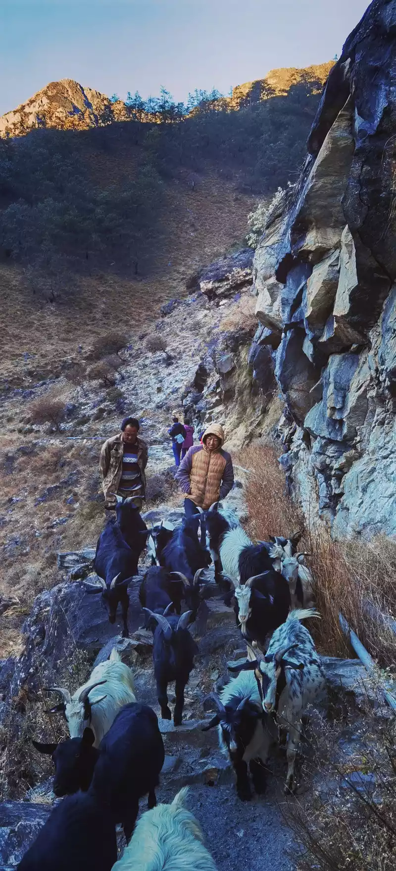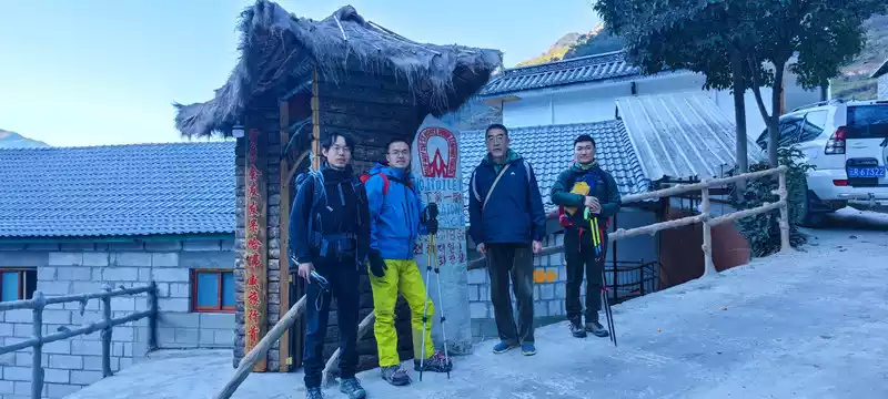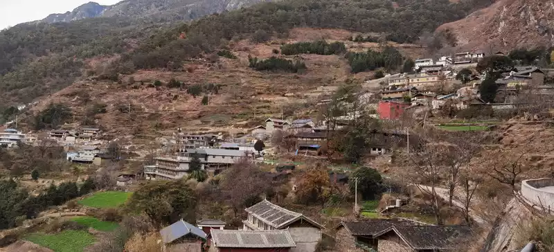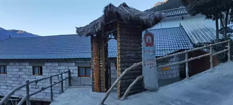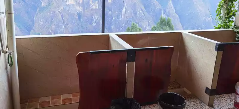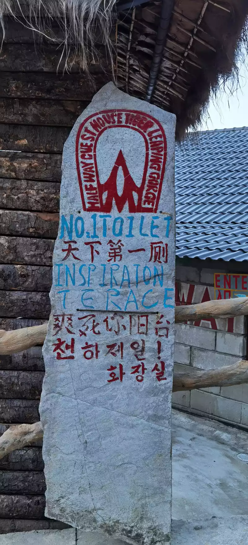 There are some scattered farmers and small mountain villages on the trail, and on the way there is an inn that is very famous among hikers, and the foreign name "Half Way " means halfway inn. It means that it is about half the way from the ditch to here. You will never think of a Chinese name, it is called the world's first toilet inn. The inn built a toilet on the cliff halfway up the mountain, half of which was a low wall, and you could squat there to enjoy the scenery outside. We drove around the back mountain thanks to the village connection project, and we stayed at this inn that night. It was late when we checked in, and as soon as we entered the door, the proprietress asked us whether we had Chinese or Western food for dinner. We were all shocked that such an inn in the mountains could actually provide coffee and Western food, which shows that there are really a lot of foreigners who come here. Standing on the roof platform of the world's first toilet inn, facing the main peak of Yulong Snow Mountain, 5,596 meters above sea level. On the other side of the mountain is Lijiang's Yulong Snow Mountain Scenic Area. We arrived here in mid-December, but there was very little snow on the top of the mountain, covering only one peak. According to the locals, snow could cover the mountainside halfway up the mountain in winter 20 years ago, and the entire top of the mountain ten years ago.I don't know if it's the greenhouse effect, or if the local climate has become drier and the snow is getting less and less. Walking on the path, I saw a public toilet with a slogan spraying "Shangri-La Toilet Revolution" on the door. It seems that in the past, every family here could enjoy the famous mountains and rivers while using the toilet. By the way, teach you two Yi characters, "male" and "female", don't go wrong.