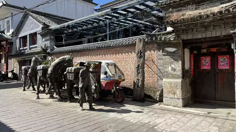 An alleyway commemorates the Ancient Tea Horse Road with stone carvings.