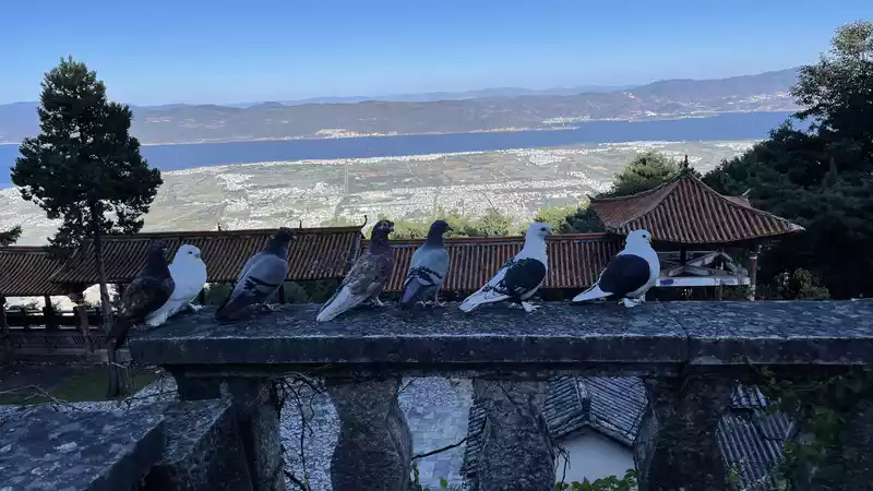 In a corner of Zhonghe Temple, a row of pigeons bathe at the foot of Cangshan Mountain.