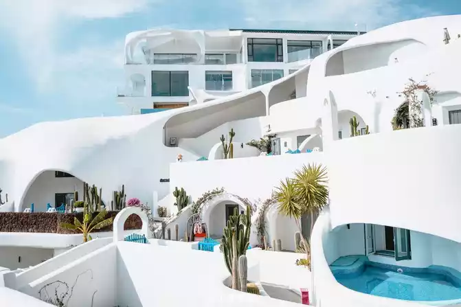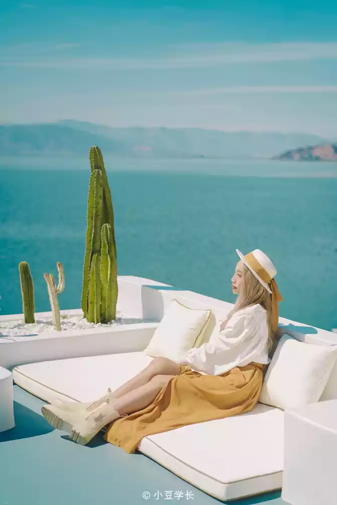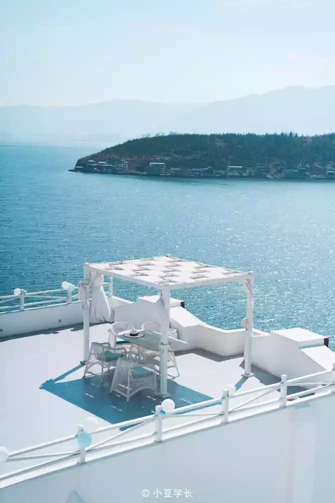 Every girl has a blue and white dream. When you come to Dali Ideal Country, this dream is not far away. It is also the most popular check-in spot in Erhai Lake in recent years. I mentioned Shuanglang and the ancient city area earlier. The last place I want to recommend is Ideal Country. Today, I recommend the Dali Songyun Cliff Resort Hotel, a B&B I'd like to recommend. It's like being transported to Santorini, offering a relaxing escape by the Erhai Lake. The rooms, like those in my previous Santorini stays, have a cave-hotel vibe. The rooms are spacious, with their own courtyard and outdoor pool.