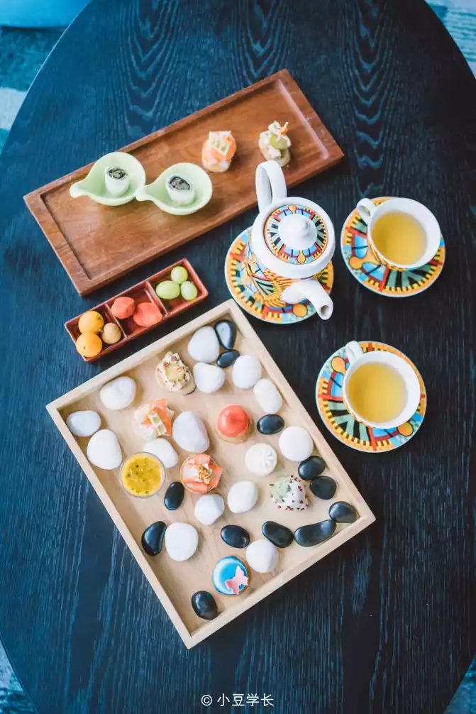 The afternoon tea pairings range from Yunnan-style scented tea with folk-style carvings on the cups, to a plate of desserts with a combination of black and white stones, three-quarter-grid fruit, and a double portion – a perfect arrangement.