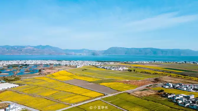 This isn't my first time in Dali. Spring is the perfect season, with temperatures approaching 20 degrees Celsius and a significant difference between day and night. Aerial photography of the yellow rapeseed flowers and green wheat fields in March creates distinct layers of color, complementing the distant Erhai Lake. This makes Dali a popular spring destination for many tourists.