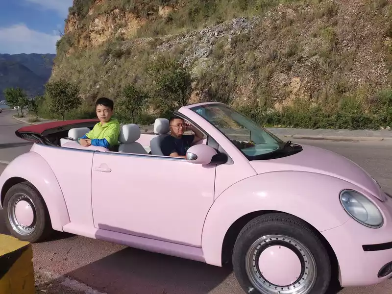 August 15th, Erhai Lake Tour. After a long trip to Cangshan, we decided to rent a car to tour Erhai Lake. My husband looked around and said, "Let's go with that Beetle you've always wanted." I was naturally delighted. We checked out several rental companies and finally booked a pink, retro-styled modified model. As soon as we got on the road, the straight-laced, old-fashioned Mr. Liao couldn't help but say, "This is your first time driving such a flashy car! It says 'Tourists are coming' right here on your head..." My son also teased me, "Mom, this car was chosen just for you. If Dad and I had chosen it, it definitely wouldn't have been pink." Luckily, when we drove along Erhai Lake, we saw cars like this everywhere. We ended up jokingly saying that this was the only car that suited us; all the others wouldn't have fit. Hahahaha