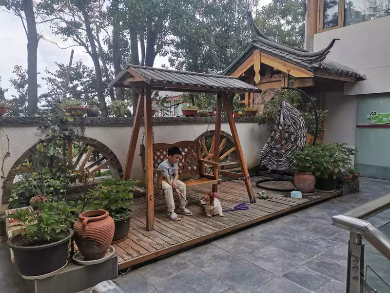 August 16th, high-speed rail from Dali to Lijiang. We booked accommodations just outside of Lijiang Old Town. Online travel guides suggested the route would be too tiring to lug a suitcase. Upon arrival, we realized our decision was a wise one: cars weren't allowed into the Old Town, making it difficult to navigate with our suitcases. B&Bs in Lijiang have unique decor styles. The suite we booked was spacious, and our dog, Xiaomi, was a real delight. We booked two nights apart and left a suitcase there when we went to Yuhu Village, making it convenient for travel.