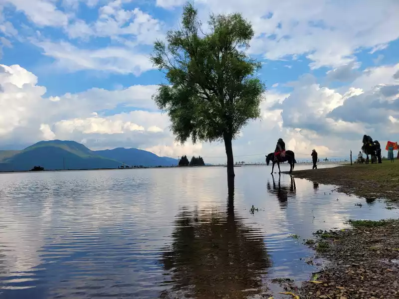 August 17th-19th, Yuhu Village, more than 40 minutes by taxi from Lijiang Ancient Town. Even in August, it's hard to see snow on Jade Dragon Snow Mountain. Given the long lines, we didn't plan to climb the mountain and instead stayed two nights in the nearest village at the foot of the mountain. My daughter came for the horseback riding, and I for the tranquility. Our hotel had two large floor-to-ceiling windows with a direct view of Jade Dragon Snow Mountain. As soon as we settled in, we couldn't wait to arrange a horseback ride. My daughter spotted a white horse upstairs. We rode to Longnu Lake, where a local boy, a skilled horseman, led the way. We later learned he was the grandson of the woman who led the horse. The next day, we even asked him to take us mushroom hunting. Although it rained, it was still a novel experience. The local children all had a healthy tan and were rather shy and reserved, though they would negotiate with me about the price of the guide. My daughter dreamed of galloping across the battlefield like the Three Kingdoms characters, riding a Ferghana horse. She told me she'd be riding again the next day and wanted to trot around on her own. But after the boy explained how he'd fallen hard on his first solo horseback ride, she finally gave up on the idea.