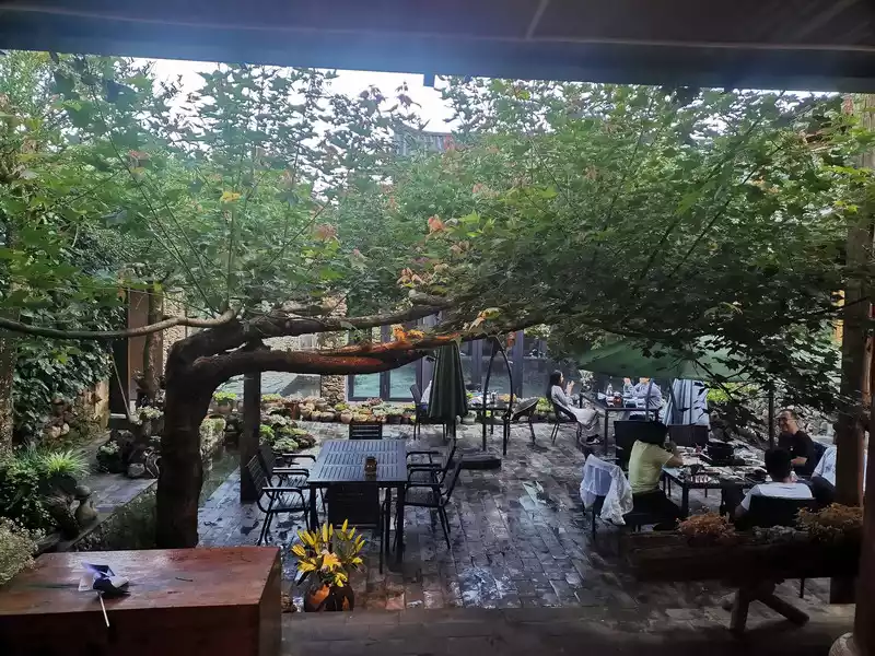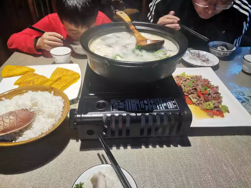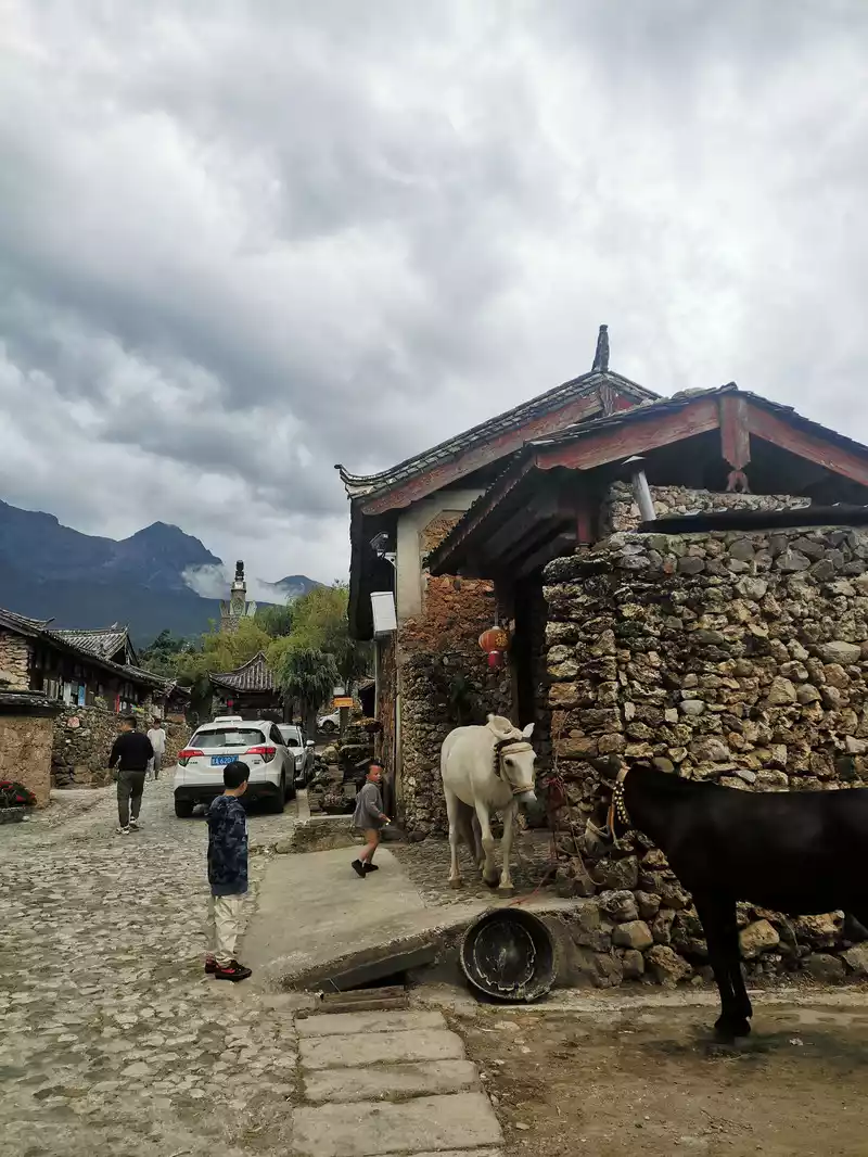 There are two highly rated restaurants in the village, each with its own unique flavors and excellent food. The villas are exquisite and elegant. One has a welcoming and cheerful owner, while the other doesn't have a menu; reservations are required, and you order by looking at the ingredients. The snow mountain fish and tofu soup was exceptional, and even my fish-loving child got a fish bone stuck in his throat for the first time. This meant rushing back to Lijiang People's Hospital the next morning for a laryngoscopic needle extraction, but that didn't dampen our spirits. On the first day, my child, obsessed with picking up cigarette packets by Longnu Lake, stepped in a ditch and stared at me with his shoes stained with black mud. Seeing his sorrowful face, I couldn't help but laugh. So pitiful! He didn't even have time to take a photo with a white horse. Back in the village, I found a small supermarket and bought him a pair of rubber shoes, the kind worn by local children. His father said he'd run so fast in those shoes as a kid, and he happily tried them on. Truly, every incident on a trip, good or bad, can become a small episode and a memory.